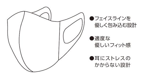 また、フェイスラインを優しく包み込む設計のため、顔にフィットし、ストレスが少なく、飛沫拡散を抑制(※)。繰り返し手洗い洗濯が可能なのも嬉しいポイントだ。