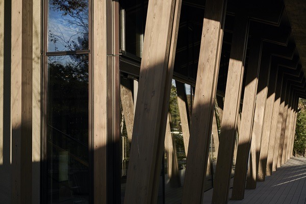 ホテル建物は、スタイリッシュで迫力がありながらも、軽井沢の自然のぬくもりが感じられるのが特徴。木質素材の80%に「長野県産唐松」を使用することで地域に寄り添い、炭素放出量の低減に貢献しているという。