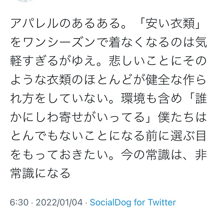 まあ、そんなわけでこの辺りの言説を守り続けているアパレル業界はますます、消費者意識と乖離していくのだろうと思う。もちろん啓蒙は大事だが、今回取り上げたどちらもポジショントークに過ぎないから、消費者には今後も響かないだろうと思って眺めている。