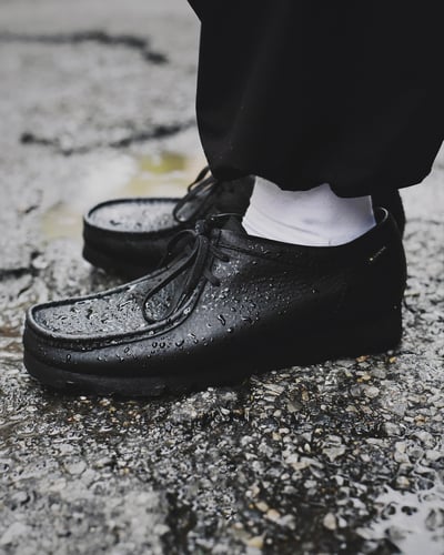 ワラビーブーツ GTXは、クラークス オリジナルズを代表するワラビーブーツをベースにデザイン。装飾用の革パッチであるフォブは、従来の別注モデル同様に2枚組となっている。インナーに伸縮性のあるエラスティックを装備し、シューレースなしで着用可能なスリッポン仕様に仕上げた。