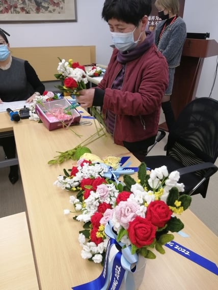 作られた花束個数は1251個。製作に参加したのは中国7地域の編物サークルで、若年から高齢者、障害者が約1万5000時間かけて編んだという。