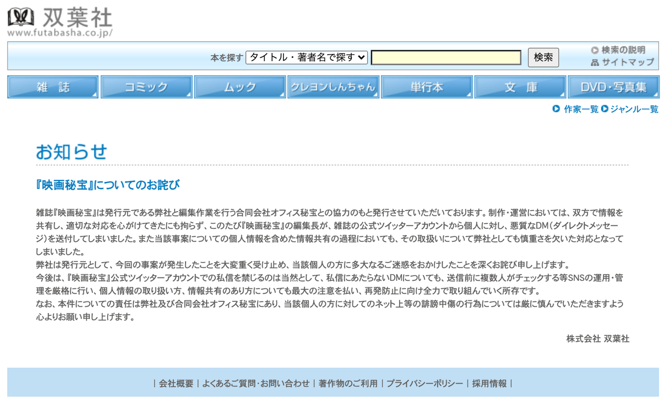 今後の「映画秘宝」の活動については休刊前最後の5月号および、3月末にオープン予定の合同会社オフィス秘宝の公式サイト内で発表するという。