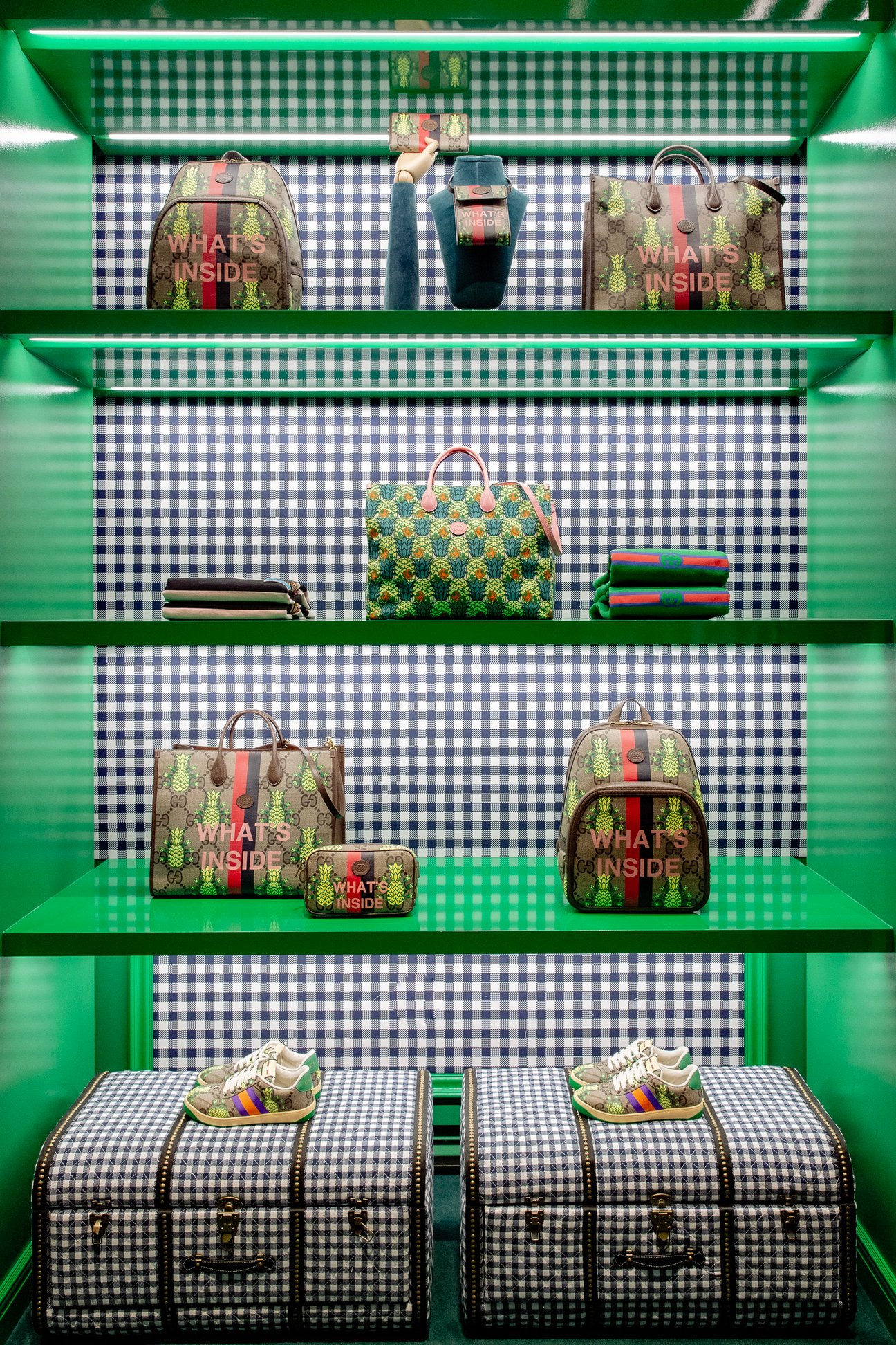 グッチ六本木メンズショップでは、パイナップルコレクションのほか、ARIAコレクションや定番アイテムなど一部ユニセックスを含む幅広いメンズアイテムを取り扱う。六本木ヒルズ内の「グッチ六本木」ではウィメンズのラインナップを中心に展開している。