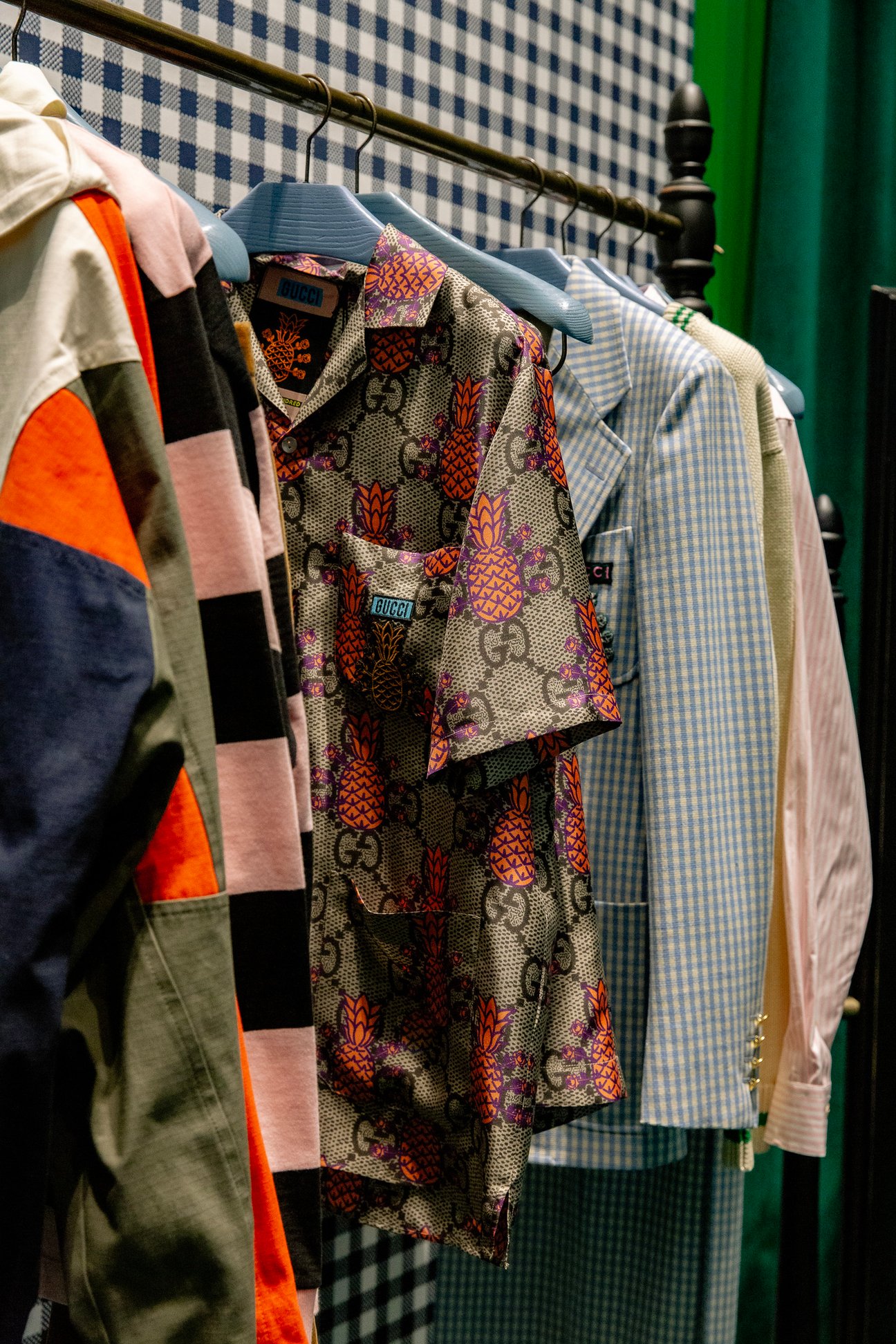 パイナップル&ローズ モチーフのイルミネーションサインが目を引くメンズショップは、けやき坂通り沿いにテンポラリーショップとして出店。吹き抜けにより開放感のある店内は2フロア展開で、1階は主にパイナップルコレクションで構成されている。店内にはコレクションにも登場する爽やかなホワイト&ブルーのチェッカー プリント ファブリックと鮮やかなグリーンを基調とした空間に、パイナップルとローズを組み合わせたモチーフが随所に取り入れられたウェアやバッグ、アクセサリーなどが並ぶ。アイテムはカレッジスタイルとストリートスタイルを融合したチアフルなムードで、胸元のパイナップルのエンブレムがワンポイントとして映えるパステルカラーのギンガムチェックのジャケットやトラックスーツ、GGパターンの軽やかなボーリングシャツなどがラインナップしている。