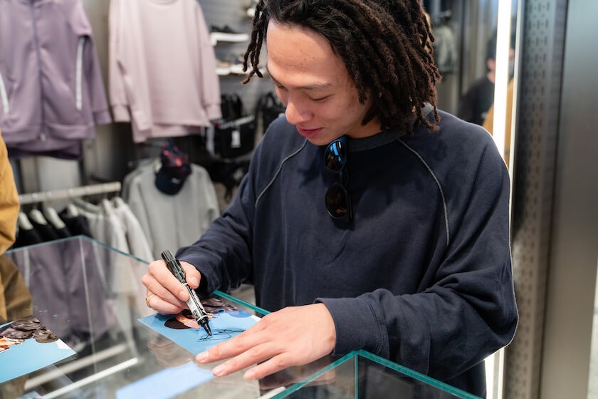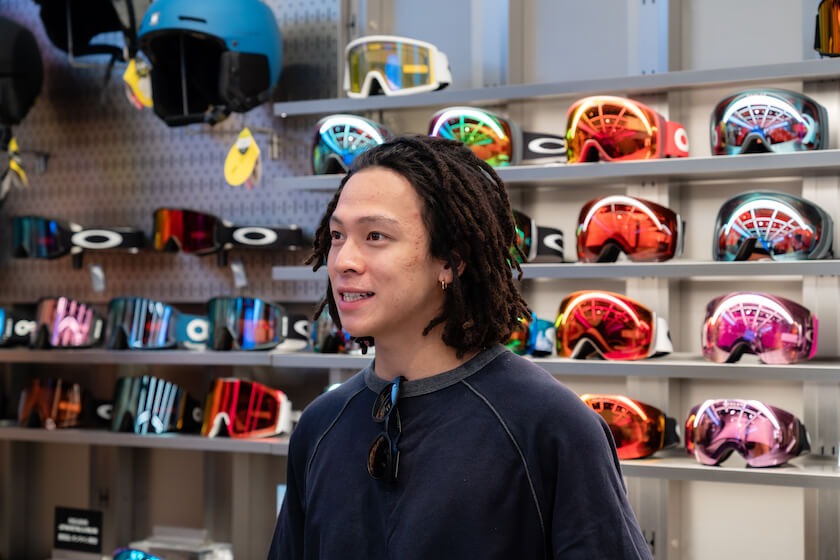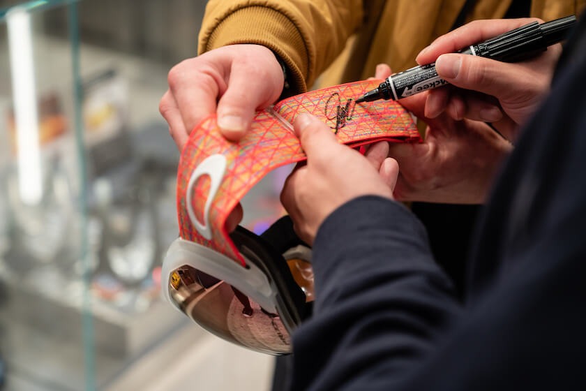 「チームオークリー」のアスリートでもある平野歩夢選手は、決勝でも「オークリー」のゴーグル「ユニティコレクション ラインマイナー」を着用して出場していた。この日、渋谷の店舗に立ち寄った平野歩夢選手は、店舗のビジョンに映し出された自身の映像をスマートフォンで撮影し、店内に入るとリラックスした表情でカードやゴーグルにサインした。