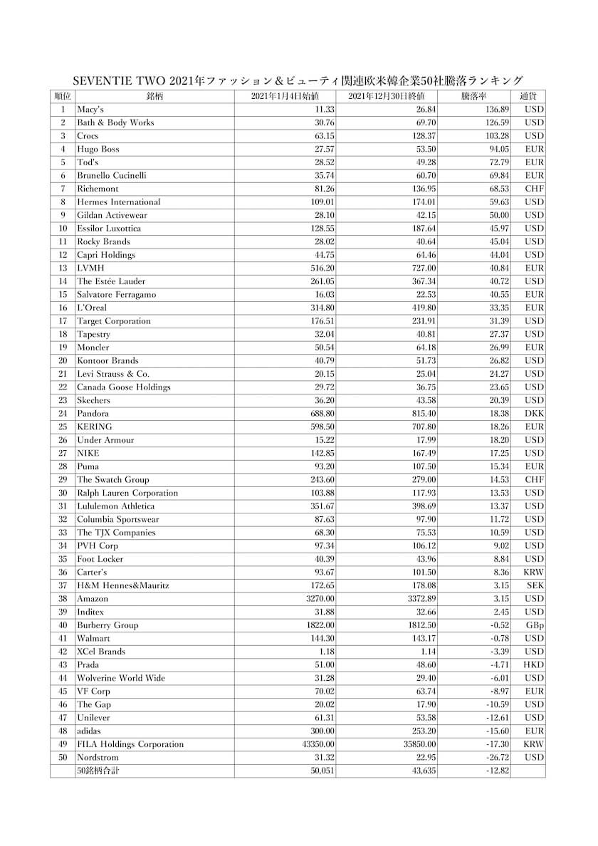 SEVNTIE TWOでは、毎月ファッション&アパレル関連日本株83銘柄株価騰落率ランキング、3カ月に1度化粧品関連日本株74銘柄株価騰落率ランキングを発表しているが、これに加えて、今後欧米&韓国のファッション&アパレル関連の50銘柄を選びその騰落率のランキングを毎月発表する。第1回の今回は、その50銘柄の紹介を兼ねて、2021年1月4日初値から2021年12月30日終値までの1年間の騰落率ランキングを作成した。