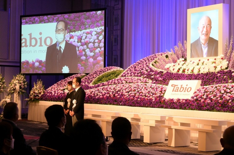繊研plusタビオの創業者、越智直正氏のお別れの会が4月8日、ホテルニューオータニ大阪で開かれた。午前と午後の部に分け、取引先約700人、タビオ社員200人が献花した。別室には、折々の思い出のパネル写真、越智さん愛用の電卓や最期の日の日記などが展示され、参列者が故人の思い出を偲んだ。