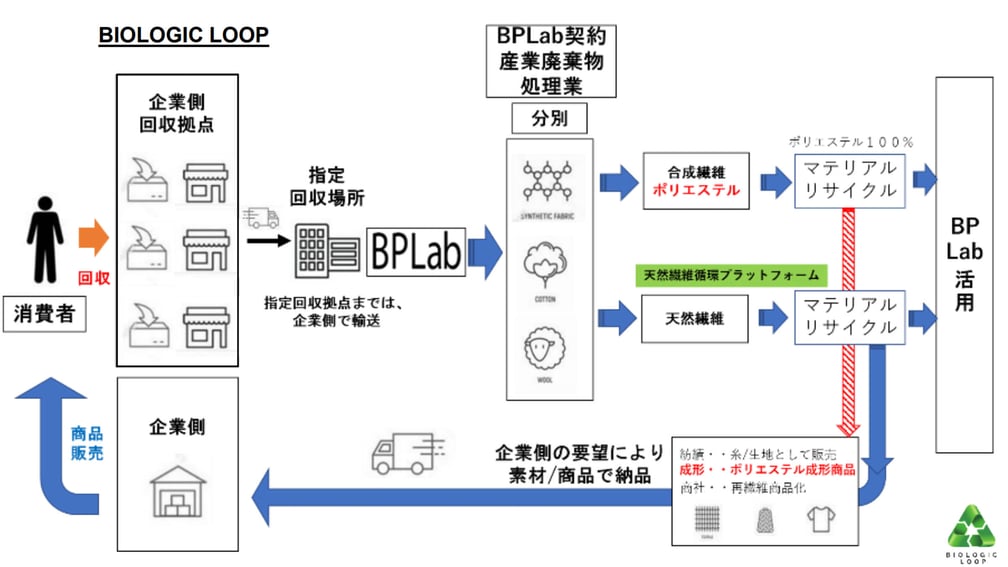 株式会社BPLabが2021年8月より取り組みを開始したBIOLOGIC LOOPは、資源を無駄にせず、廃棄をしないことを目的とした繊維製品の循環プラットフォームである。この活動は一般社団法人サーキュラーエコノミージャパンと連携をしており、この運用を通じて「さまざまな企業と消費者を繋ぎ、新しい価値をつくり、ライフスタイル産業全体が循環型産業へ移行することを目指している」とのことだ。