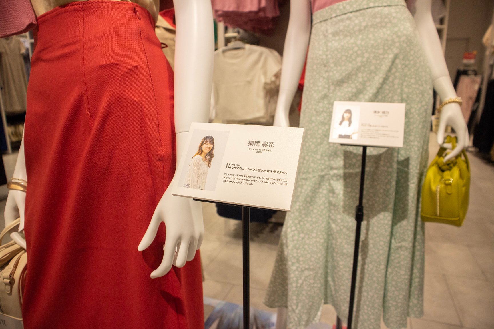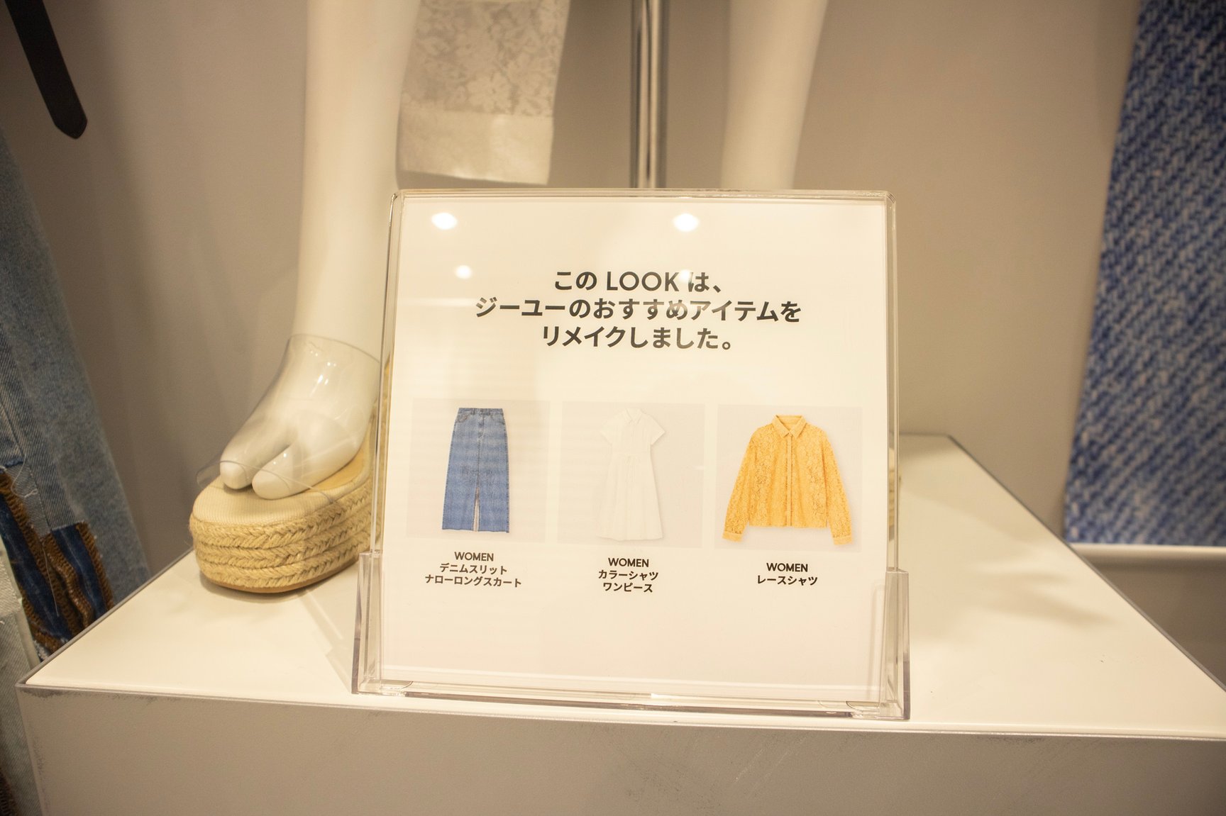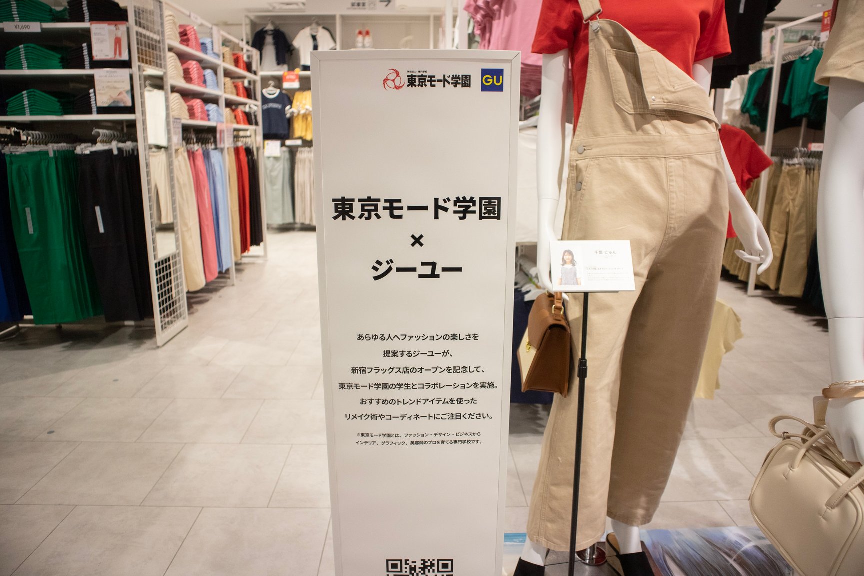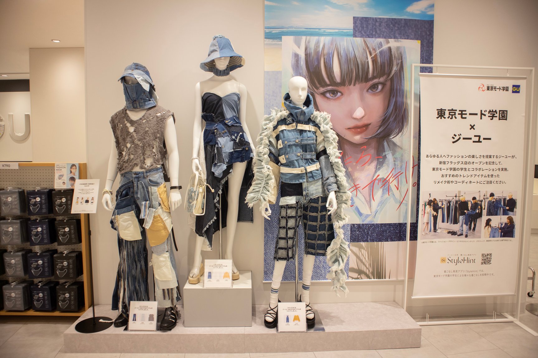 同じくオープン時の施策として東京モード学園とタイアップし、学生によるスタイリングを展示。店舗の中にいながら学生世代のリアルな着こなしを体験してもらうことが狙いだという。また、ファーストリテイリングが提供する着こなし発見アプリ「スタイルヒント(StyleHint)」でも学生のコーディネートを投稿しており、アプリ上でそのまま商品を購入することができる。そのほか、7階には東京モード学園の学生がGUの商品をリメイクした作品を展示。今後も客の声に応じて展示作品を増やす予定だという。担当者は「ファストファッションはサステナブルの観点から無駄が多いという声もある。服を無駄にしないという意味ではこの取り組みは意味があるのでは」とコメントしている。