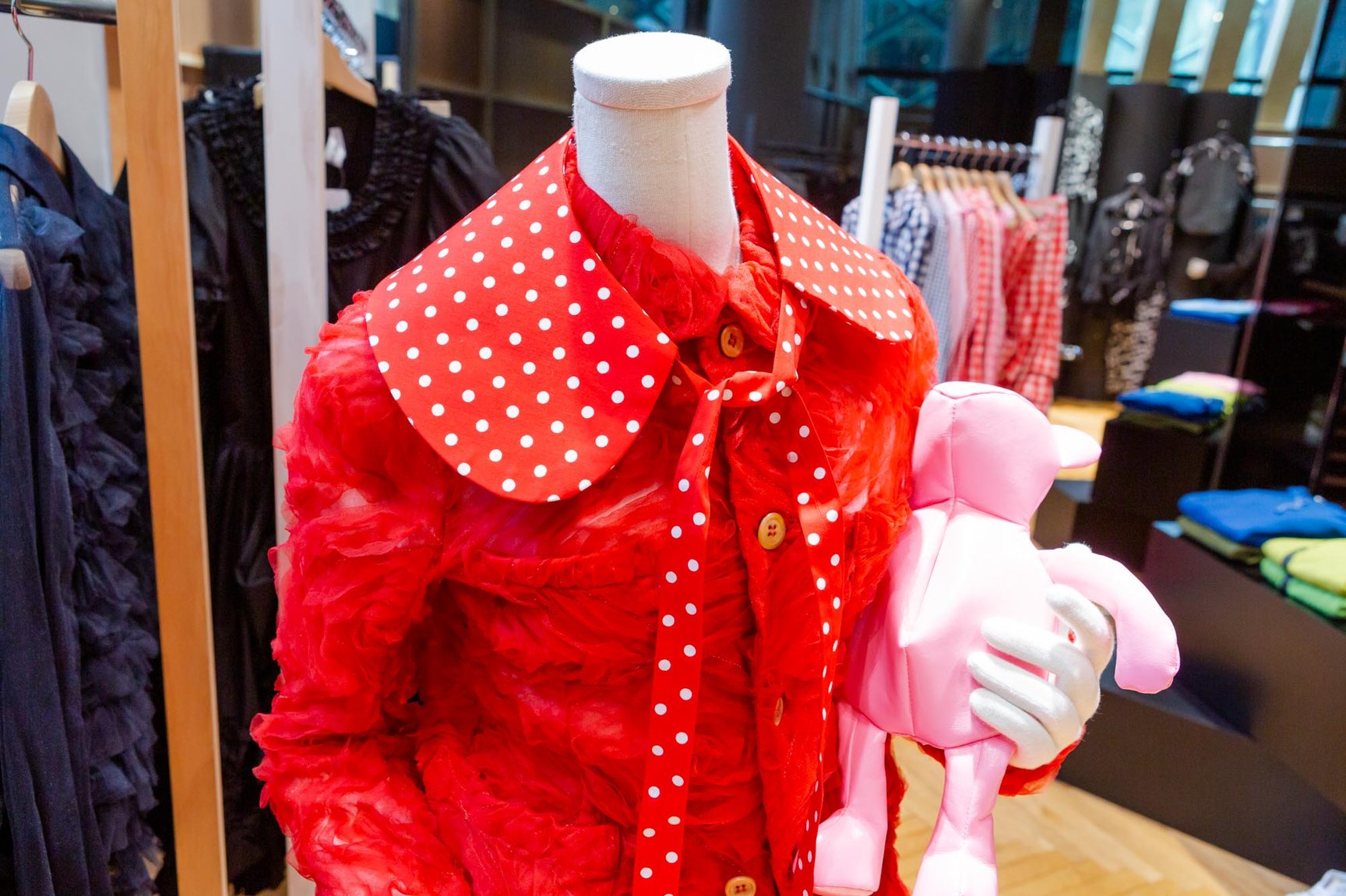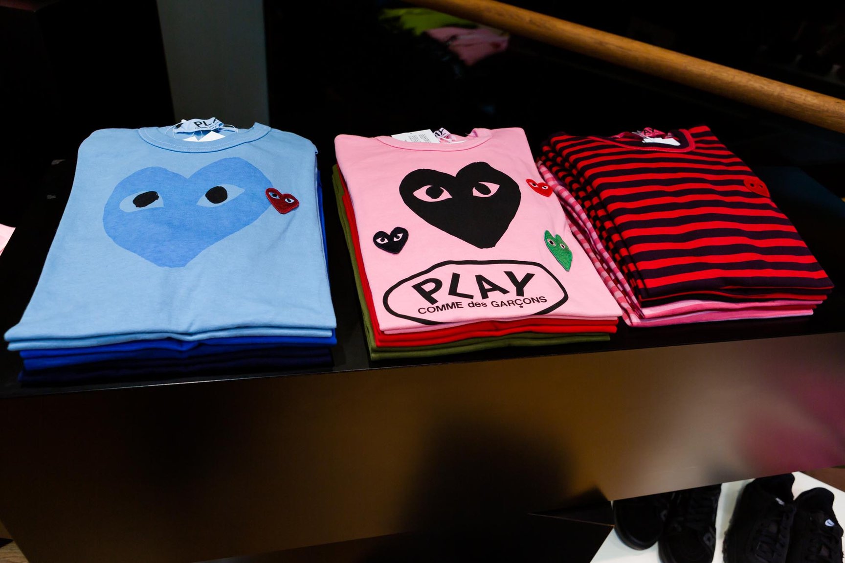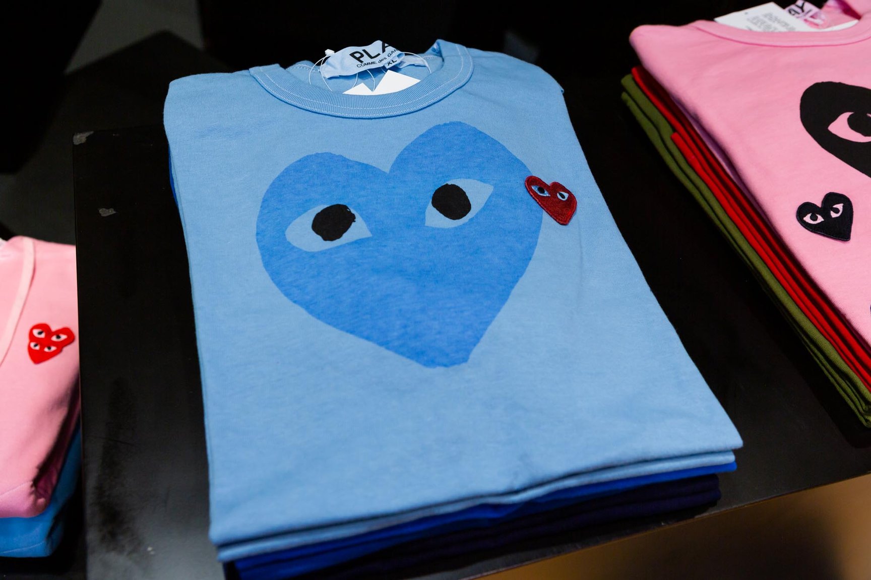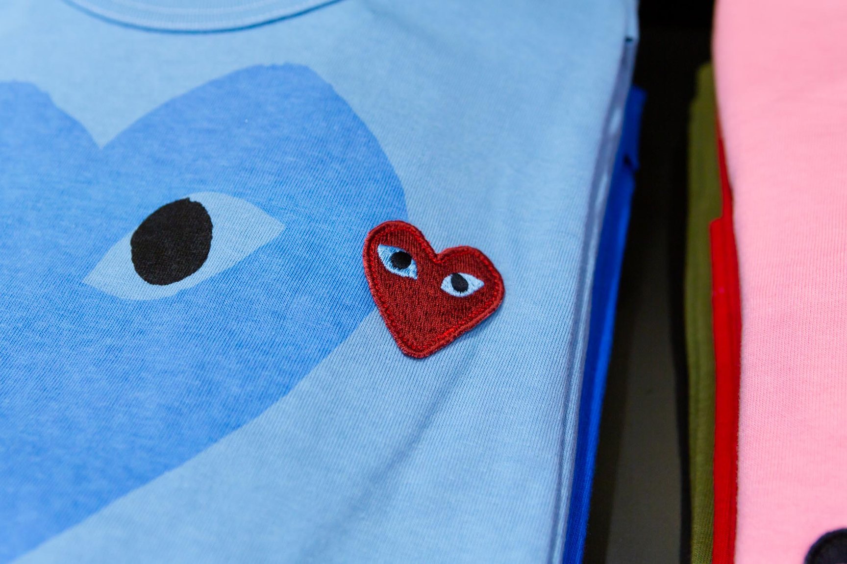 同店のコンセプトは「最後までコム デ ギャルソンらしい方法で売り切る」で、シーズンを跨いで販売している「ブラック コム デ ギャルソン(BLACK COMME des GARÇONS)」と「コム デ ギャルソン ガール(COMME des GARÇONS GIRL)」を中心に、「シーディージー(CDG)」などのアイテムをセールシーズンではない今、スペシャルプライスの50%オフで販売。アイテム数は約1500点で、セール対象外の限定アイテムとしてリボンのブローチ(1万3200円)、付襟(9900〜1万4300円)、クマ型のバッグ(2万4200円)をはじめ、今回のために製品染め加工を施した「プレイ コム デ ギャルソン(PLAY COMME des GARÇONS)」のTシャツやフーディーなどを展開している。限定アイテムはスタイリングのアクセントになるアイテムがメインで、セールアイテムの新たな着こなしを提案する。また、マーケットの雰囲気を作るため店内でアイテムを持ち運ぶ際に使用できる非売品のショッピングバッグも用意している。