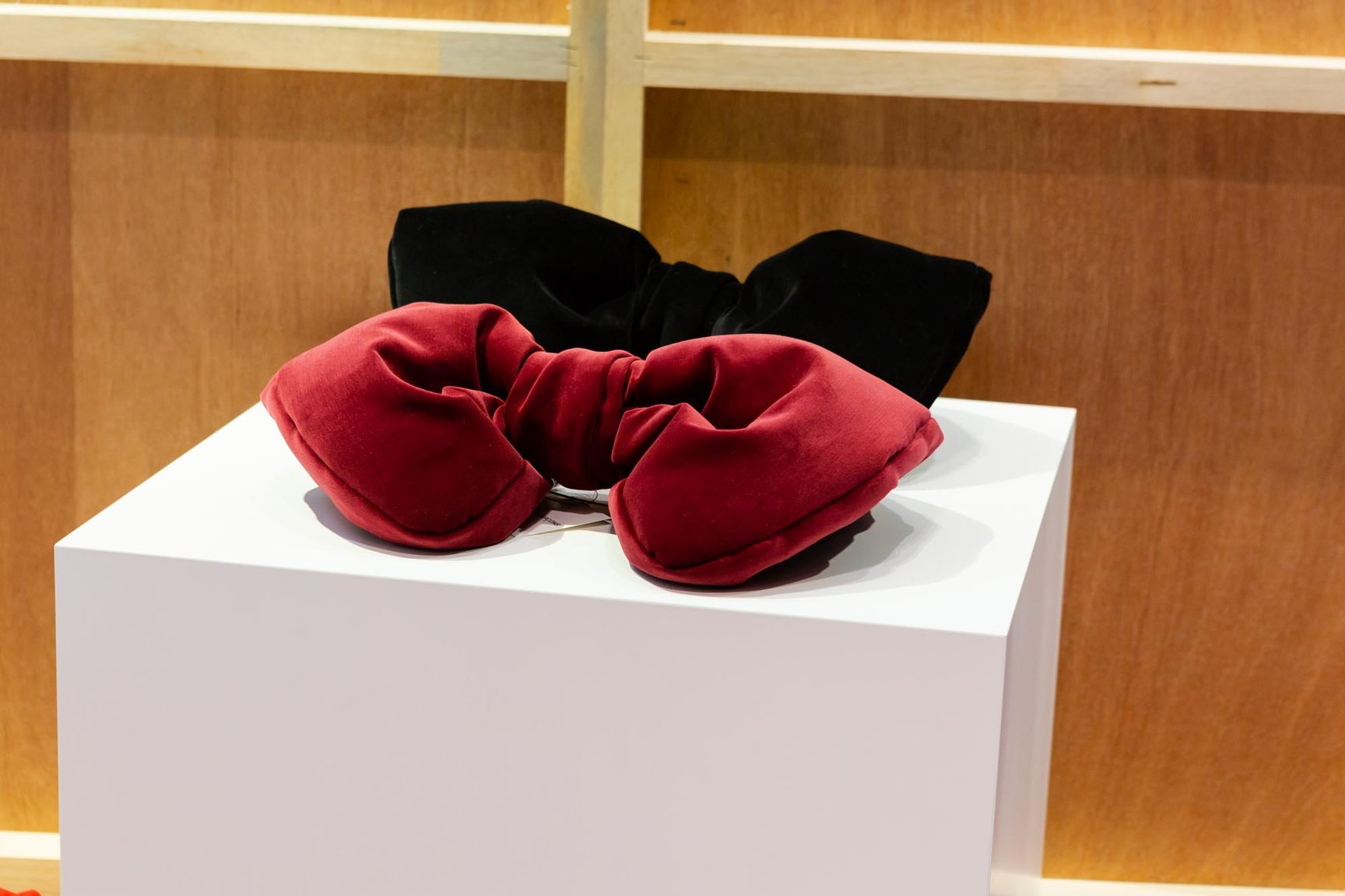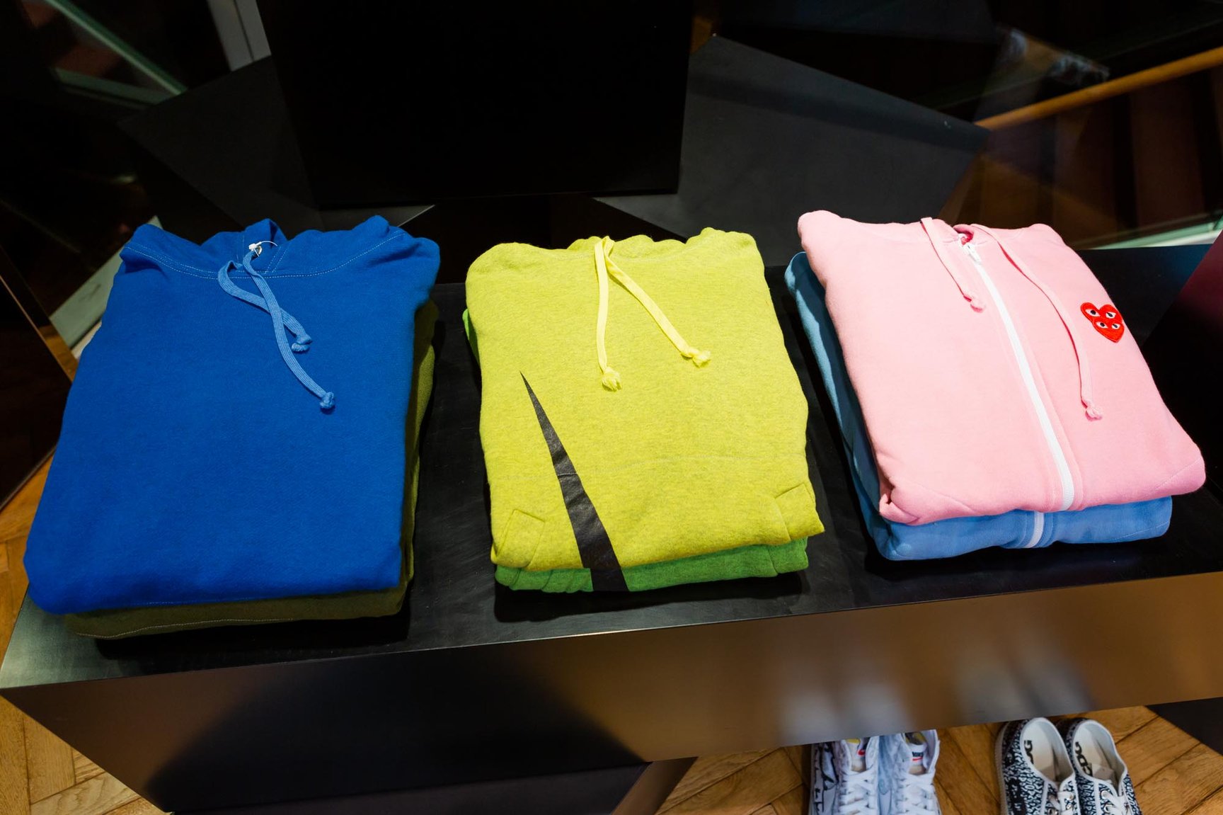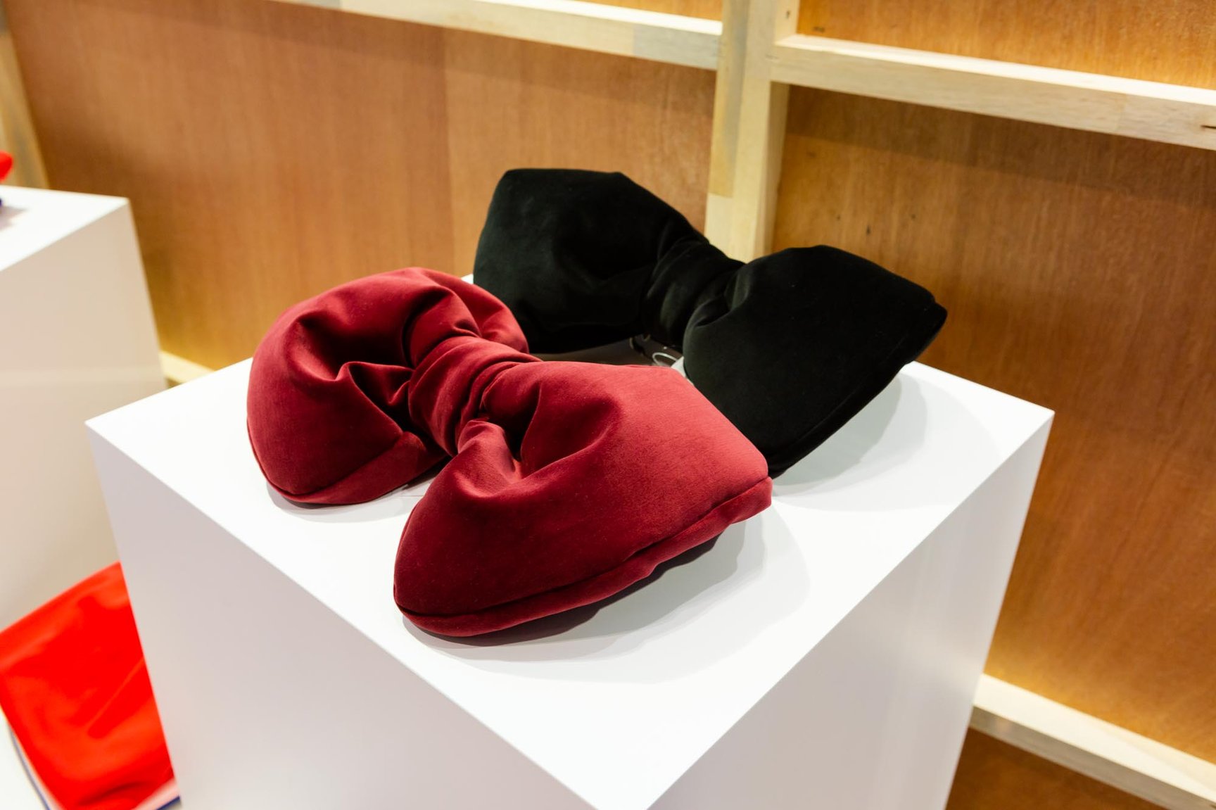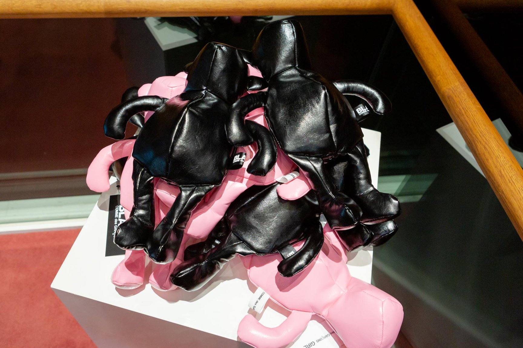 同店のコンセプトは「最後までコム デ ギャルソンらしい方法で売り切る」で、シーズンを跨いで販売している「ブラック コム デ ギャルソン(BLACK COMME des GARÇONS)」と「コム デ ギャルソン ガール(COMME des GARÇONS GIRL)」を中心に、「シーディージー(CDG)」などのアイテムをセールシーズンではない今、スペシャルプライスの50%オフで販売。アイテム数は約1500点で、セール対象外の限定アイテムとしてリボンのブローチ(1万3200円)、付襟(9900〜1万4300円)、クマ型のバッグ(2万4200円)をはじめ、今回のために製品染め加工を施した「プレイ コム デ ギャルソン(PLAY COMME des GARÇONS)」のTシャツやフーディーなどを展開している。限定アイテムはスタイリングのアクセントになるアイテムがメインで、セールアイテムの新たな着こなしを提案する。また、マーケットの雰囲気を作るため店内でアイテムを持ち運ぶ際に使用できる非売品のショッピングバッグも用意している。