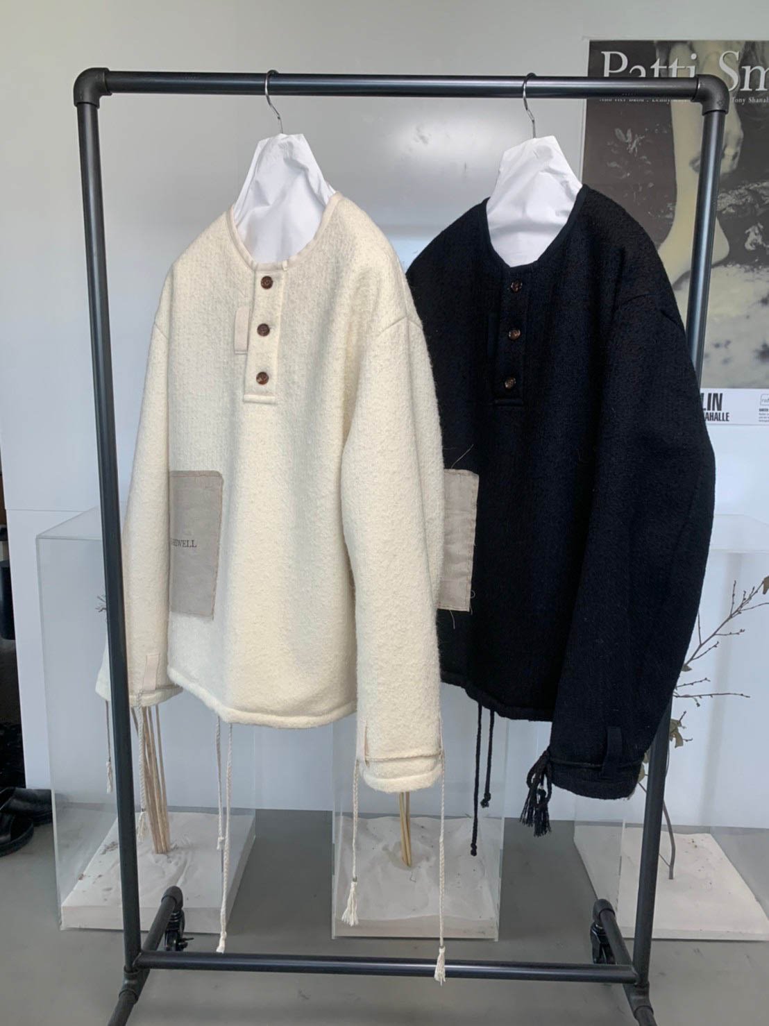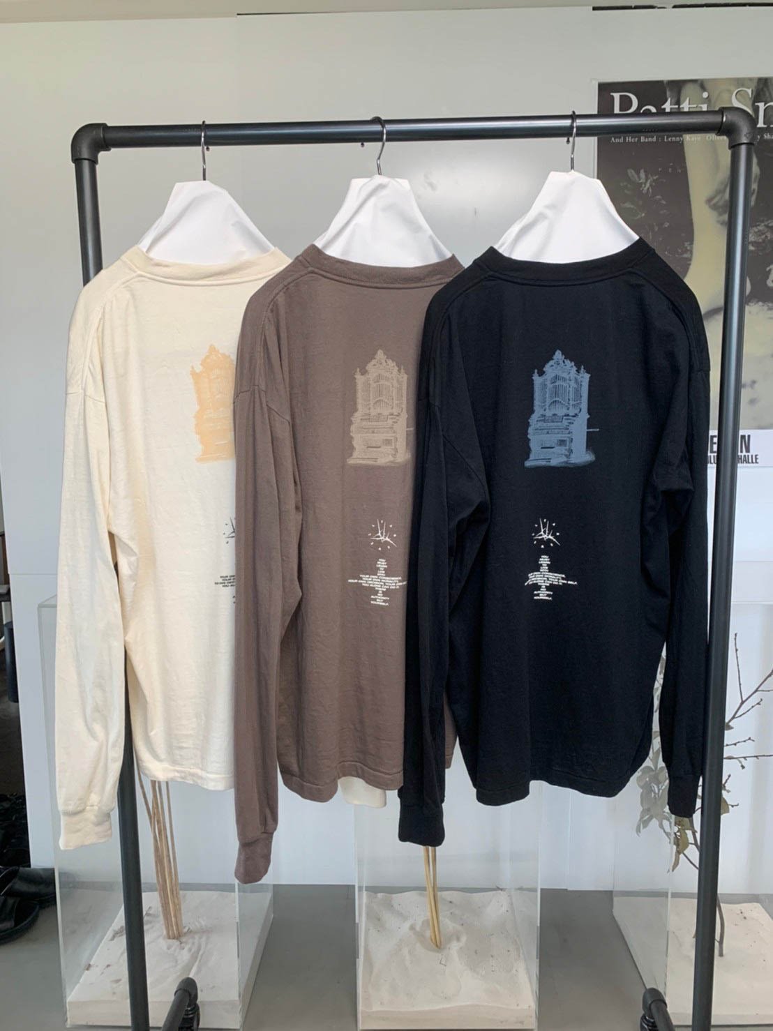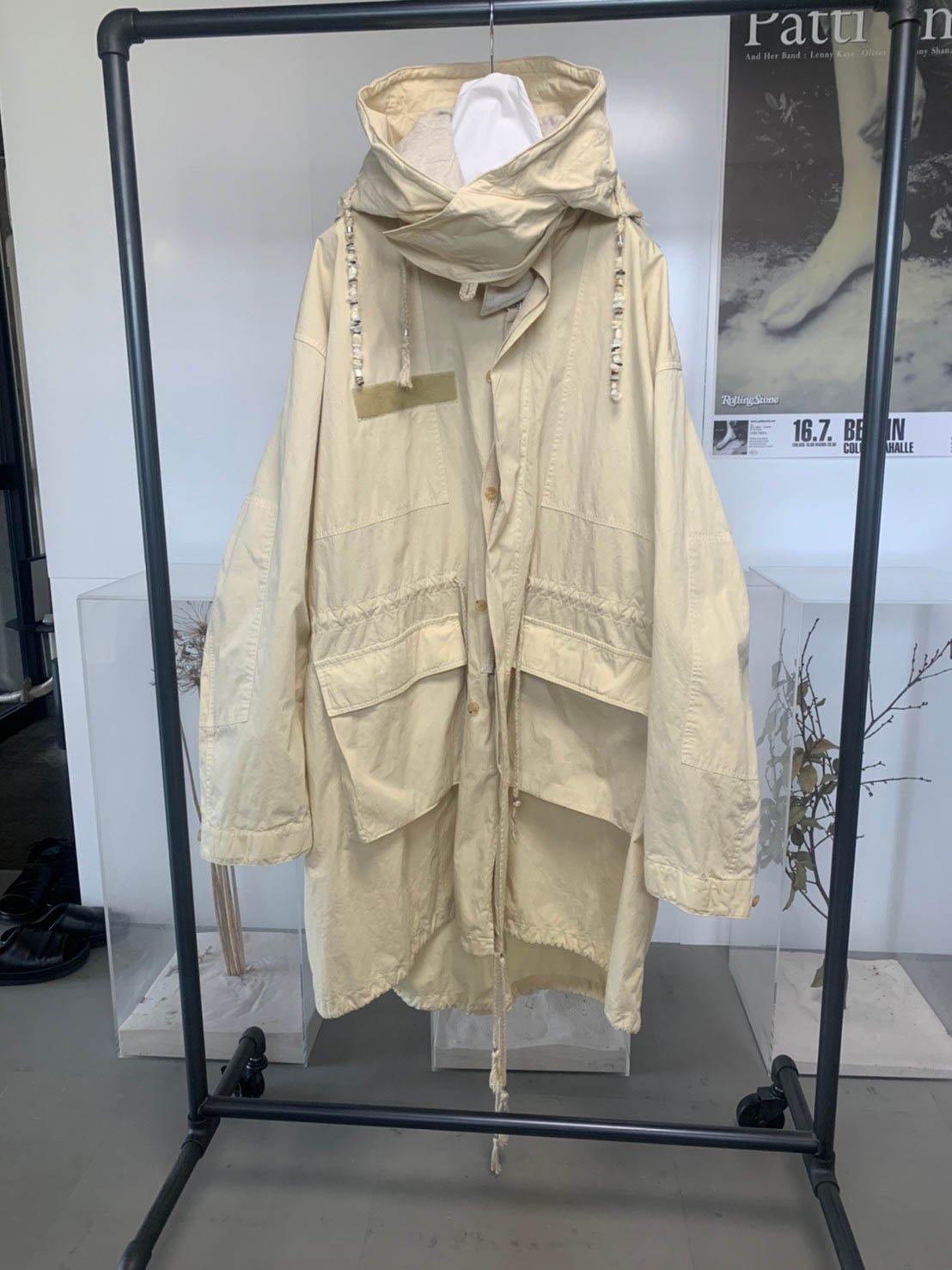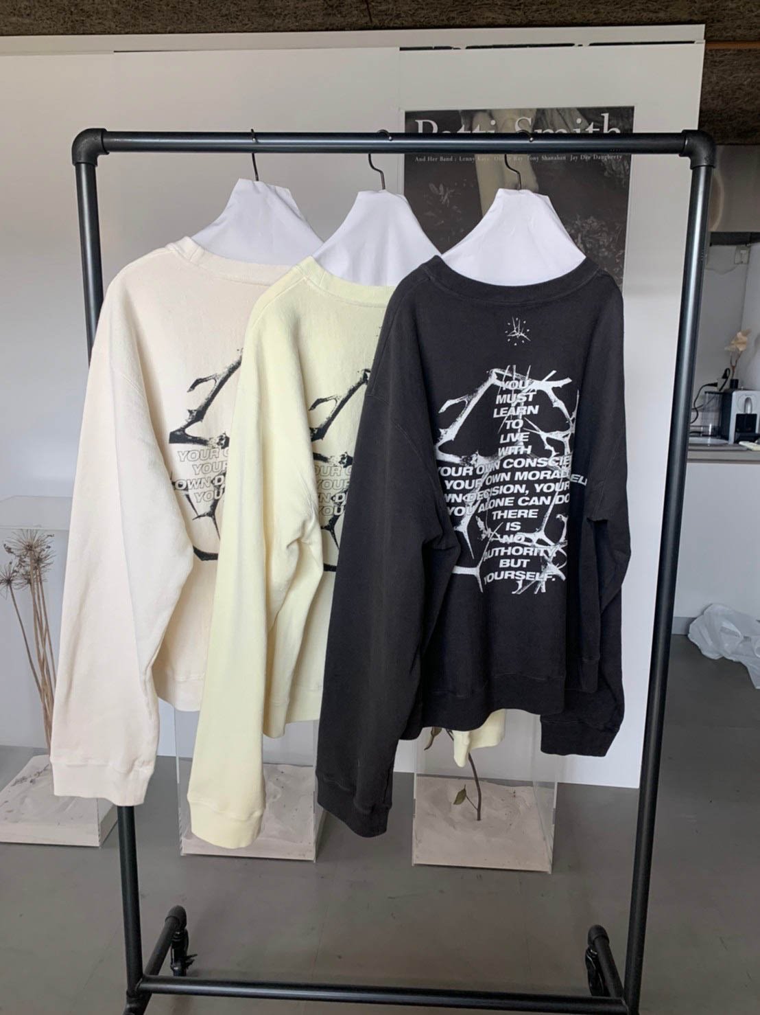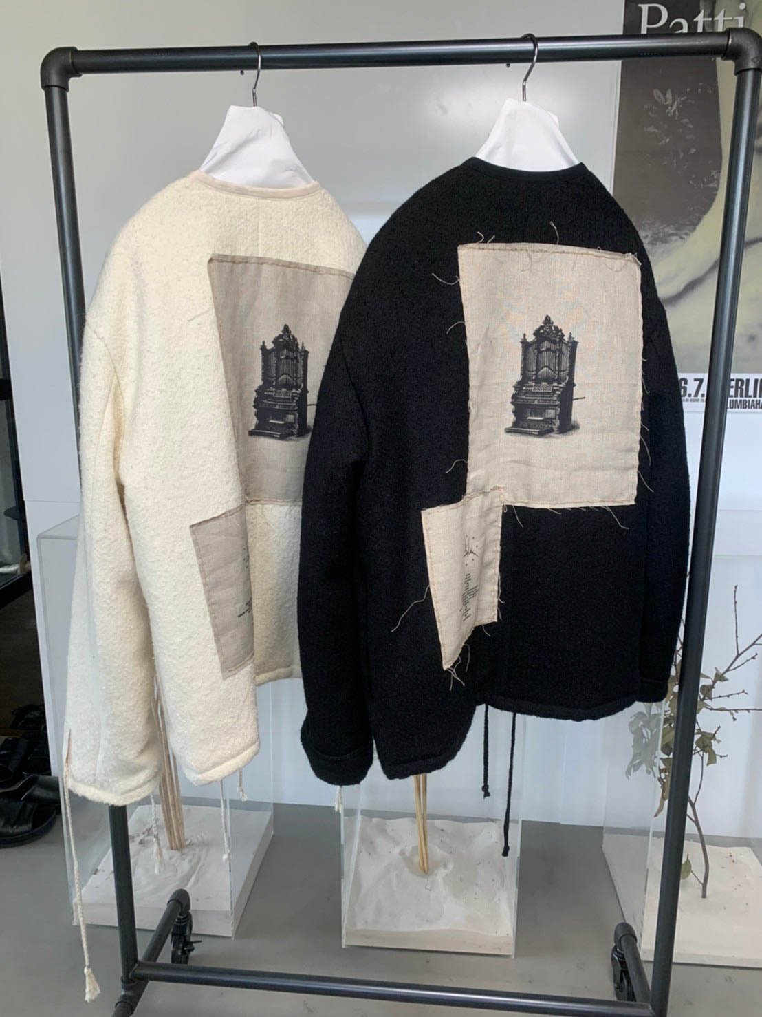 古着のライナーを取り付ける事ができる仕様で、厚みや織り方、素材など実際にミリタリーで着用されるモッズコートを再現した「Over Dyed Mods Parka with Stones」(8万5000円)をはじめ、宮沢賢治の小説に出てくる蝶のモチーフを編み地で表現したニット「Henry Neck Sweater with Butterfly」(3万3000円)や、カシミヤゴートを素材に仕様した巻きスカート「White Fur Skirt」(14万5000円)、クラスの曲の歌詞がプリントされたロングスリーブTシャツ(1万7000円)、スウェット(2万8000円/いずれも税込)など計10型をラインナップする。