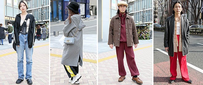 (写真左から)カッパのトラックジャケットにデニムと90年代っぽいストリートカジュアルな女性。(渋谷)/定点観測でもしばしば登場する「うさぎのカメラマン」によるブランド「FR2」のジャージパンツの女子に遭遇。バスケットボールウエアのようなフレアのシルエットにサテンのイエローで女子のラグジュアリーストリートスタイルに。(渋谷)/中目黒のアーニーパロのセットアップがモンドな雰囲気だった男性。(渋谷)/ヴィンテージスタイルの差し色コーディネートとして真っ赤なジャージーパンツを履いていた男性。(原宿)
