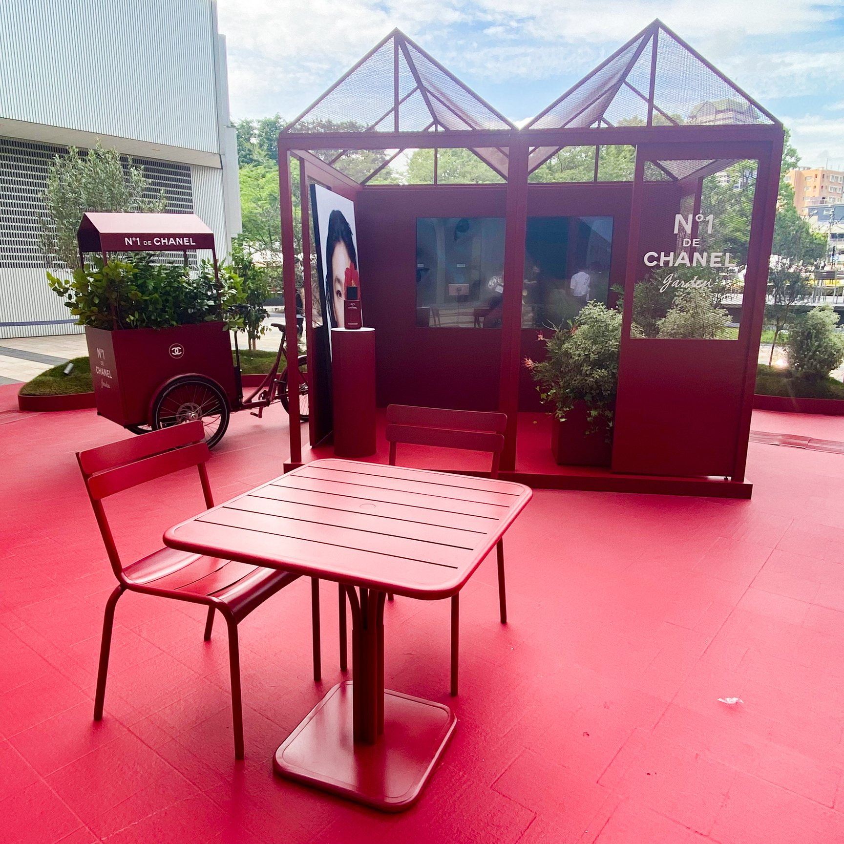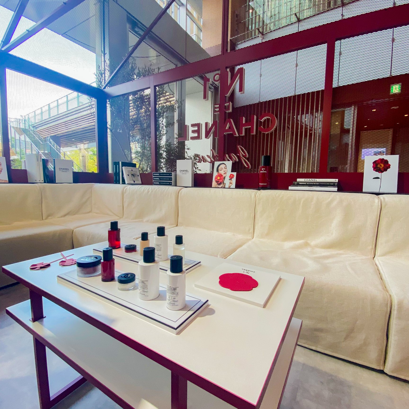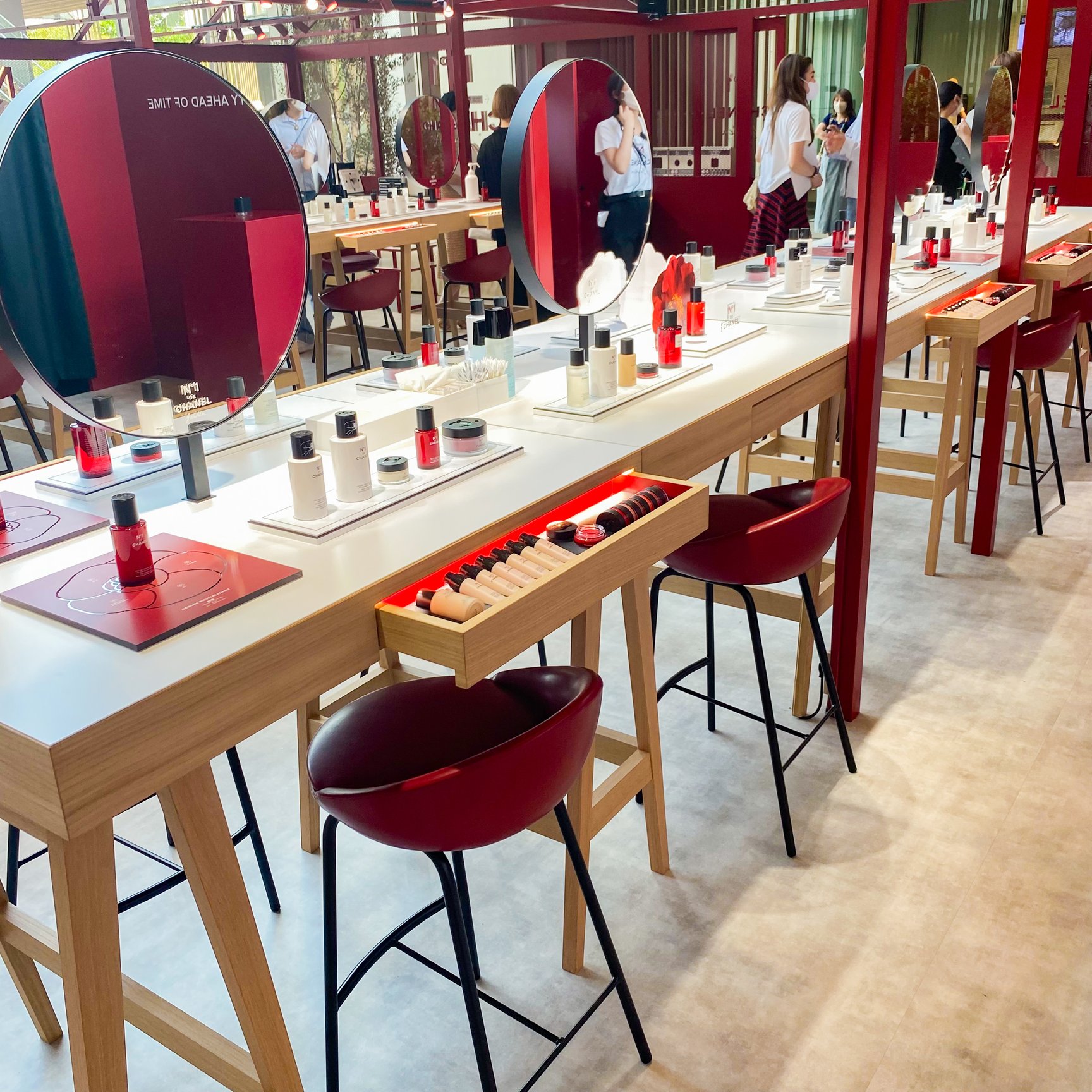 会場中央のタッチアップスペース「ビューティ バー」では、新作「ボディ ミスト N°1 ドゥ シャネル」や、レギュラーラインナップに追加する50mLの「セラム N°1 ドゥ シャネル」のほか、フルラインナップを試すことができる。ビューティ バーではワークショップも開催。スタッフによる同ラインの効果的な使用方法のレクチャーや、自分だけのレッド カメリアを制作できるペーパー フラワー ワークショップなどを行い、特別なパワーを秘めた植物、レッド カメリアについて、そしてオープンスカイ ラボラトリーでのシャネルの植物研究と栽培、CSRの姿勢について多角的に学ぶことができる。予約制のワークショッププログラムでは、人気イラストレーターのfoxcoや、モデルでコラムニストの大屋夏南を招いた特別企画も実施予定だ。