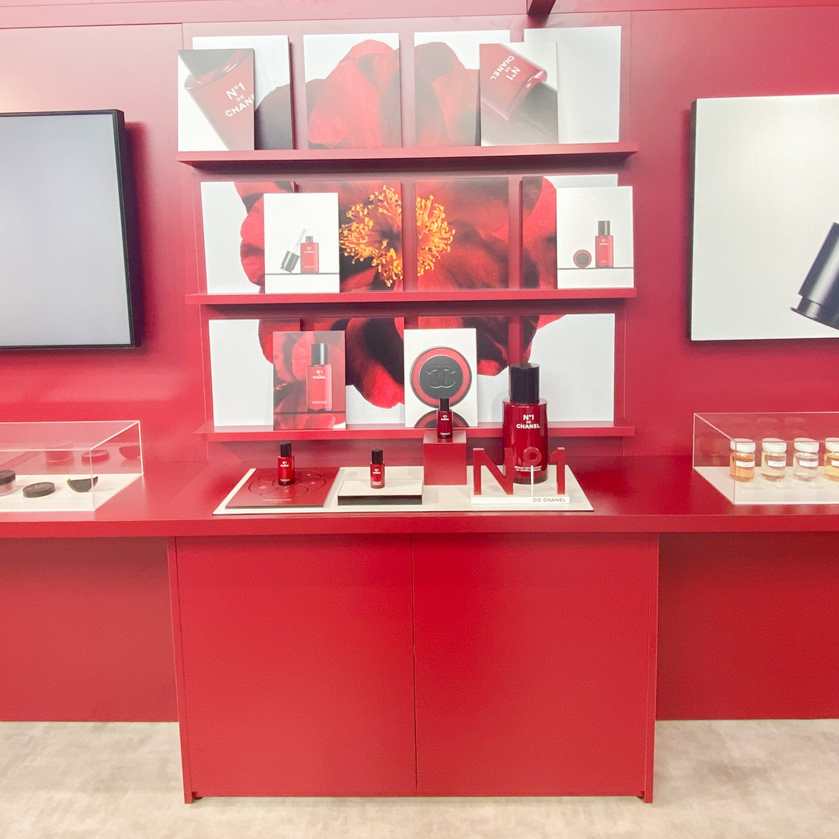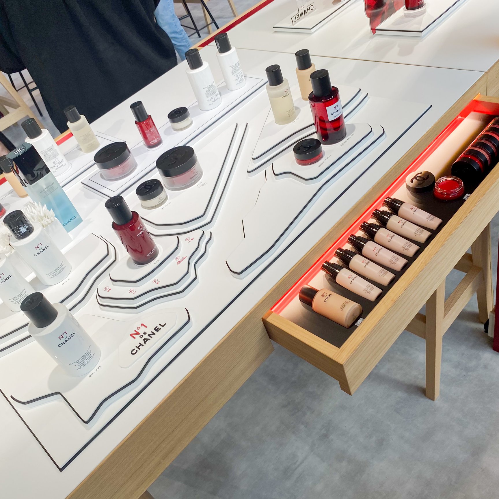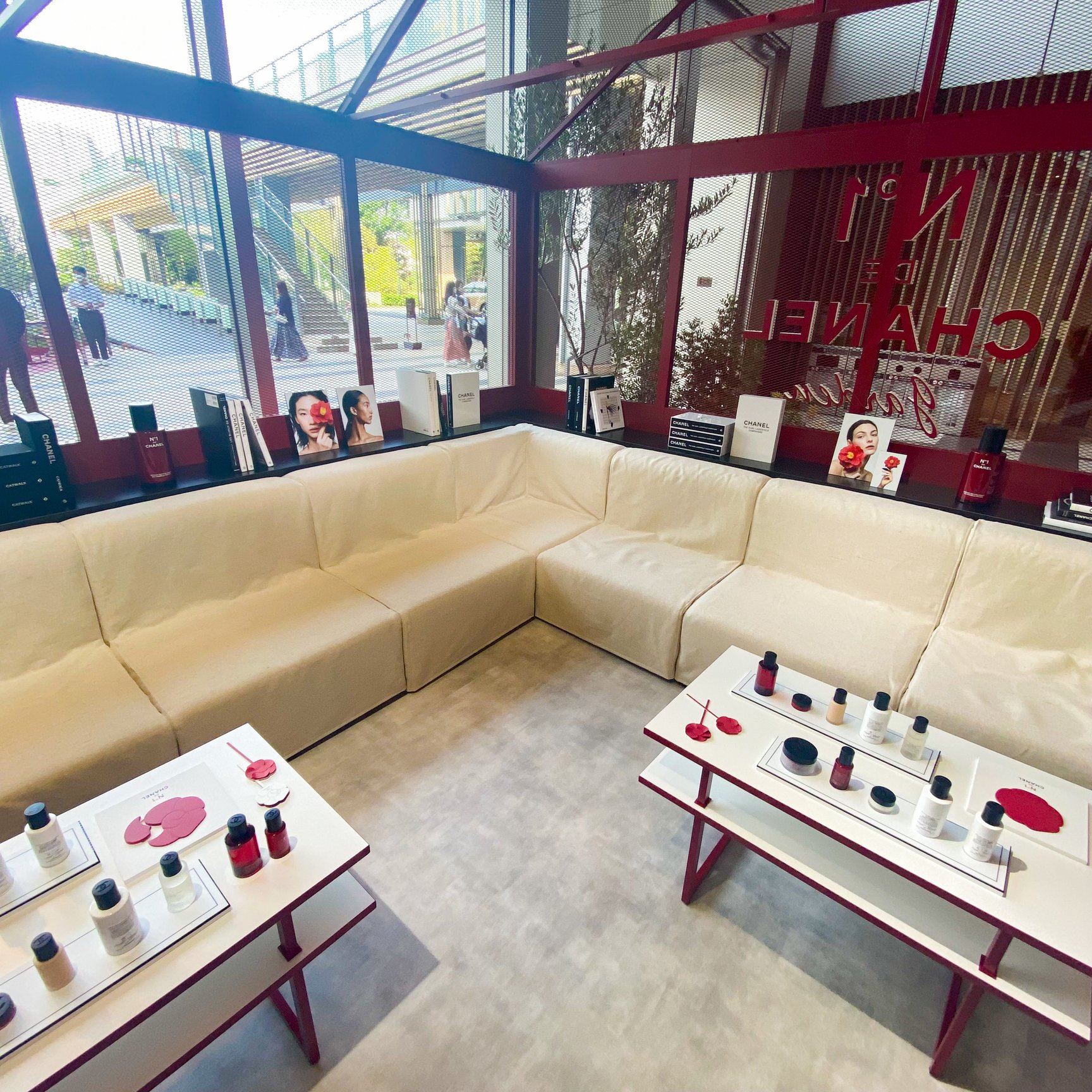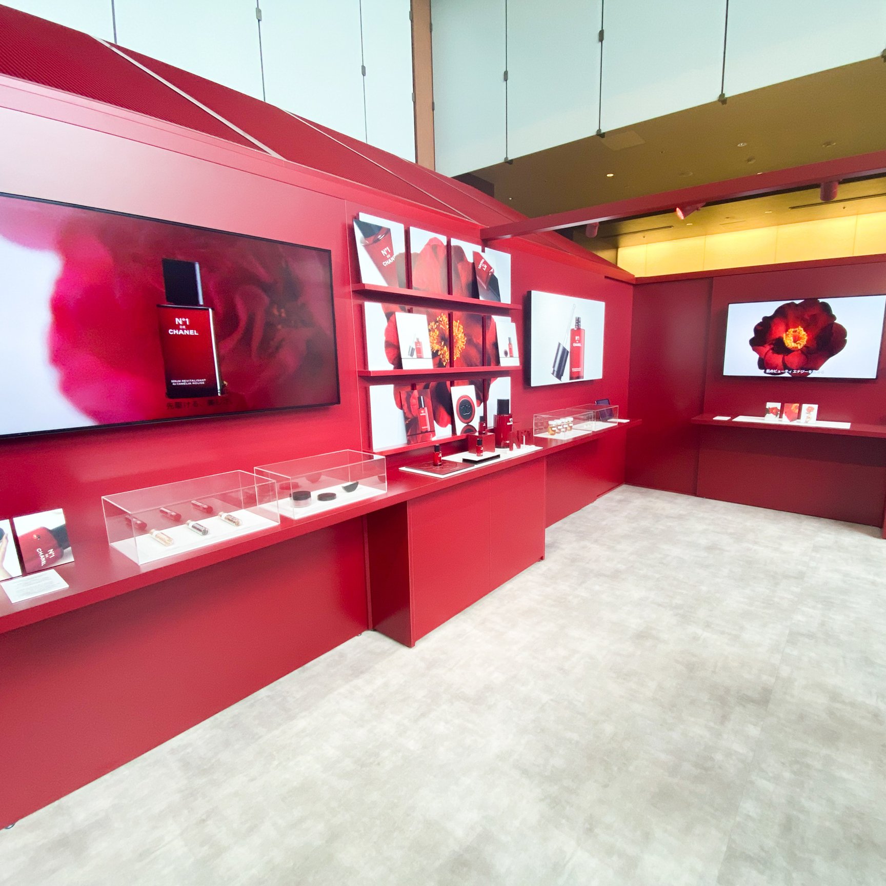 会場中央のタッチアップスペース「ビューティ バー」では、新作「ボディ ミスト N°1 ドゥ シャネル」や、レギュラーラインナップに追加する50mLの「セラム N°1 ドゥ シャネル」のほか、フルラインナップを試すことができる。ビューティ バーではワークショップも開催。スタッフによる同ラインの効果的な使用方法のレクチャーや、自分だけのレッド カメリアを制作できるペーパー フラワー ワークショップなどを行い、特別なパワーを秘めた植物、レッド カメリアについて、そしてオープンスカイ ラボラトリーでのシャネルの植物研究と栽培、CSRの姿勢について多角的に学ぶことができる。予約制のワークショッププログラムでは、人気イラストレーターのfoxcoや、モデルでコラムニストの大屋夏南を招いた特別企画も実施予定だ。