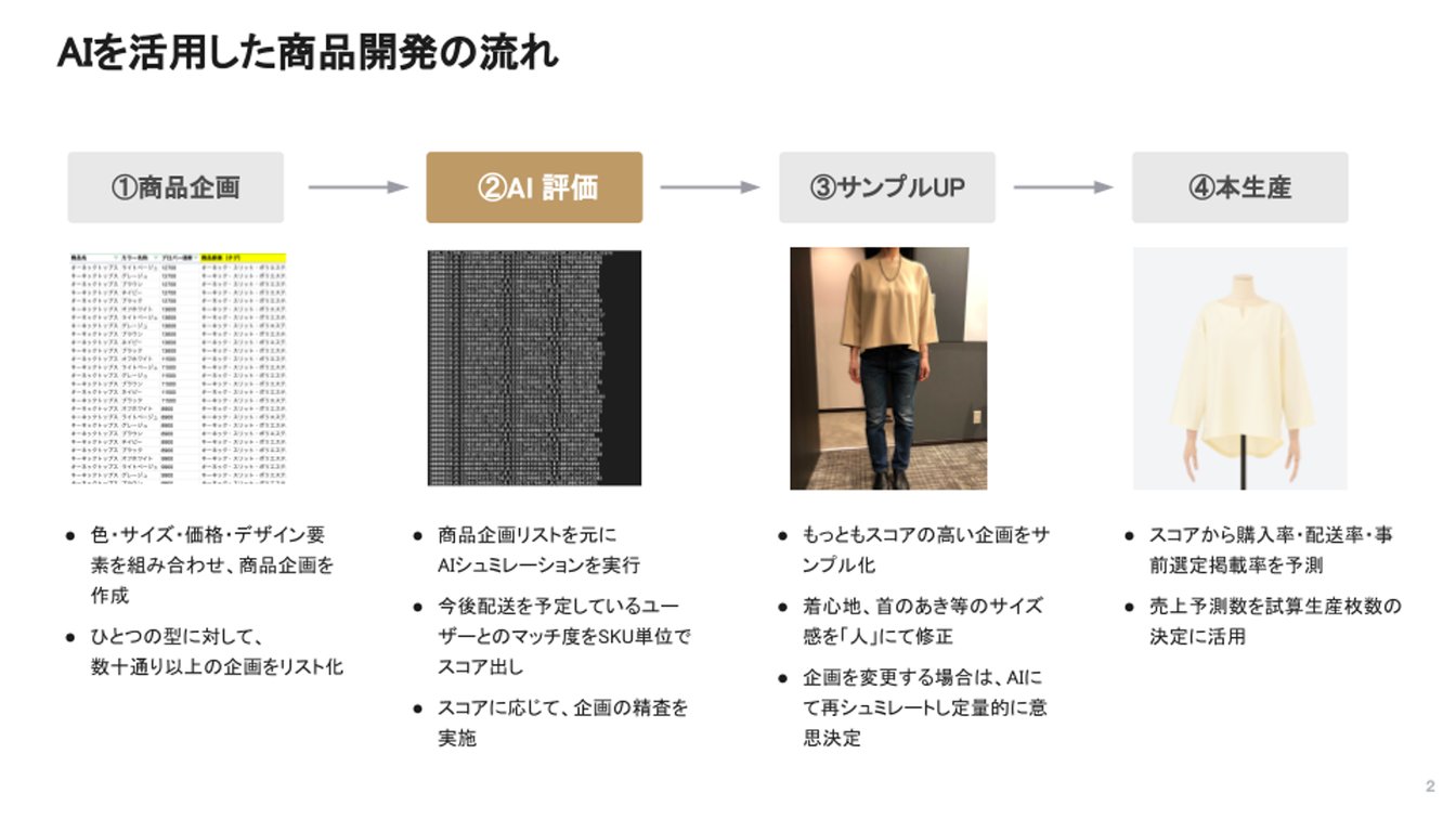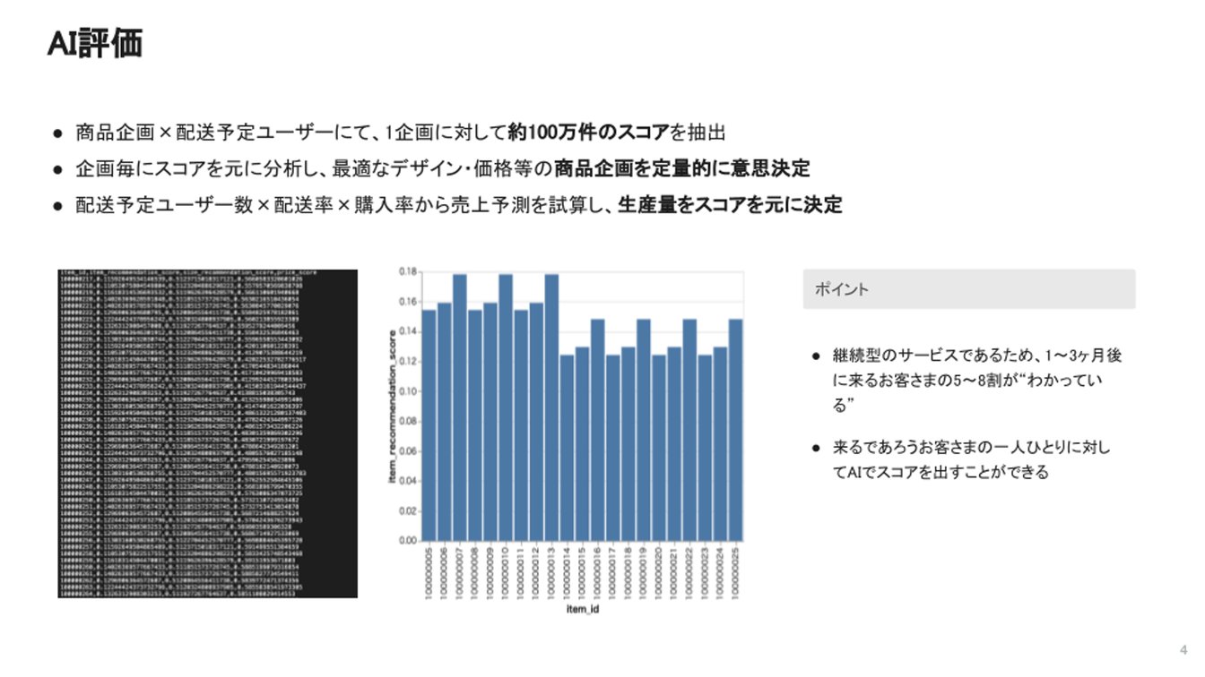 また、商品開発においては大量の企画の中からAIスコアが高い商品のみを開発しています。既存サービスのAIモデルを流用してスコアを算出しており、既存サービスでのAI実績なくして成り立たないスキームとなっております。」