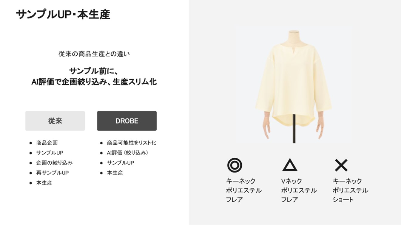 「現在はDROBEのAIスコアを用いて、大量の企画のなかから売れ行き予測が良いアイテムのみ生産するというスキームで商品を開発しております。具体的には、2022年のFW以降にノーリーズとの別注商品としてニット・ブラウスなどのアイテムを販売予定です。今後も自社だけでなく別注も含めて生産していきますが、DROBEというサービスのなかでは服・ブランドの多様性も必要と考えているため、多くても全体の取り扱いのなかではは2割程度におさえる形で想定しています。ニット・ブラウスについては元々カテゴリーとしての需要が高いこと、パートナーのノーリーズさんが得意とされていることから選びましたが、特にDROBEとしてカテゴリーを決め込んでいるわけではなく、今後はボトムスやアウターの開発もしていきます。