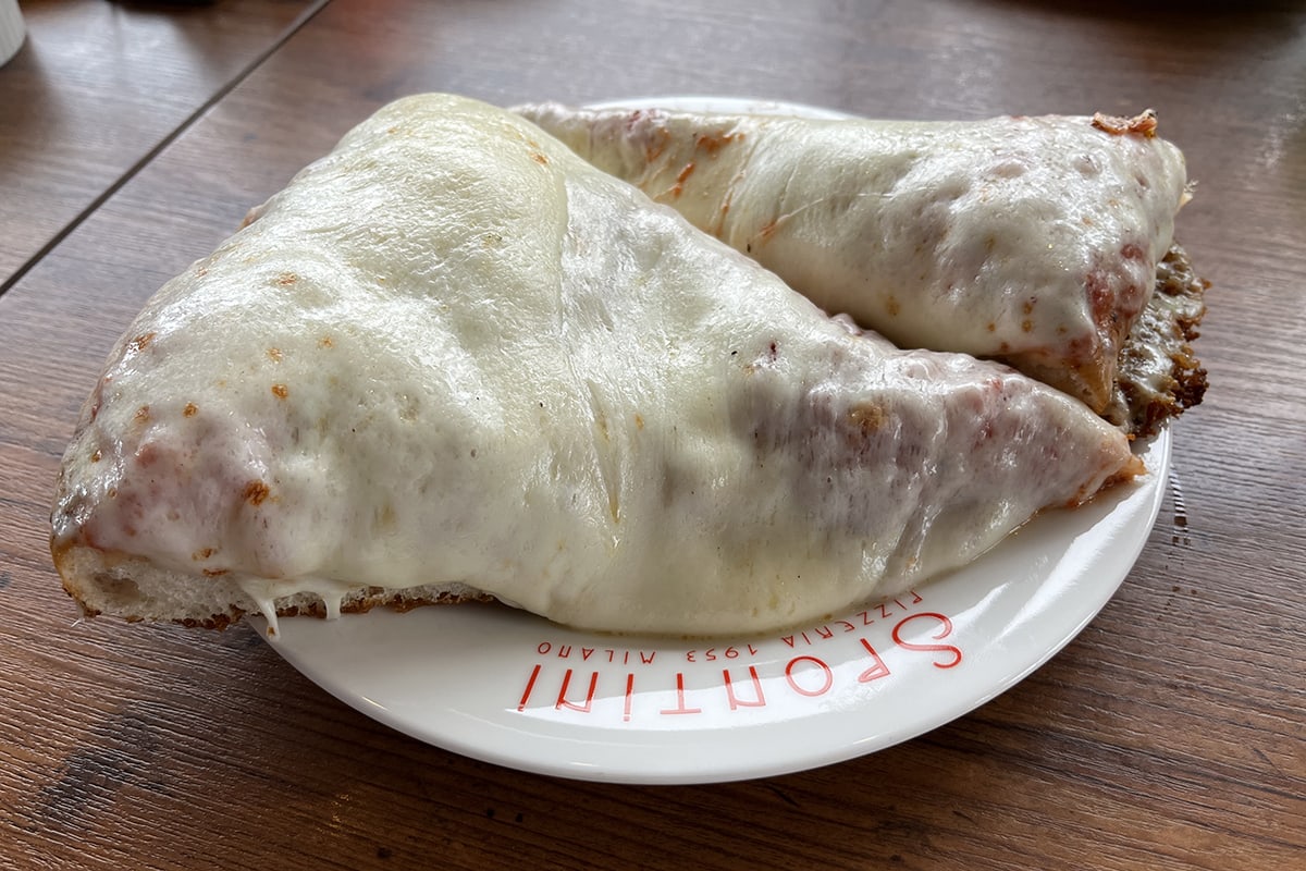 チーズの芳醇な香りとコク、酸味のある濃厚なトマトソースがベストマッチ。フレッシュなトマトの風味で意外とあっさり食べられる。普通、ピザといえば耳を折って食べるのがポピュラーだが、スポンティーニのピザではそうもいかない。なのでナイフとフォークで切り分けて食べるのがおすすめ。まるでパンケーキを食べ進めるかのような感覚が新鮮である。