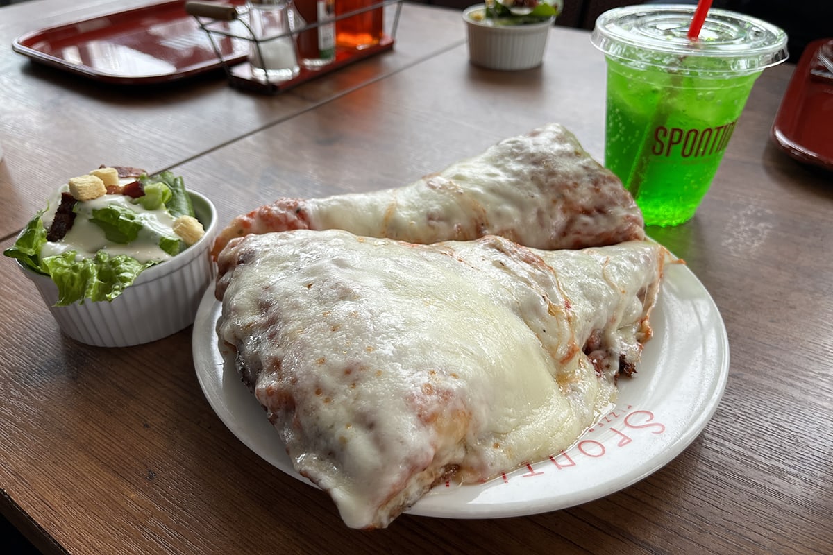ダブルモッツァレラチーズはスポンティーニの名物と言っても過言ではないメニュー。雪山のようにこんもりと盛られて、溶け出すモッツァレラチーズが眩しい。「アボンダンテ」とは日本で言うところの「大盛り」的な意味。1枚+ハーフサイズのピザが付いてくる。なんだかお得感があって素敵だ。