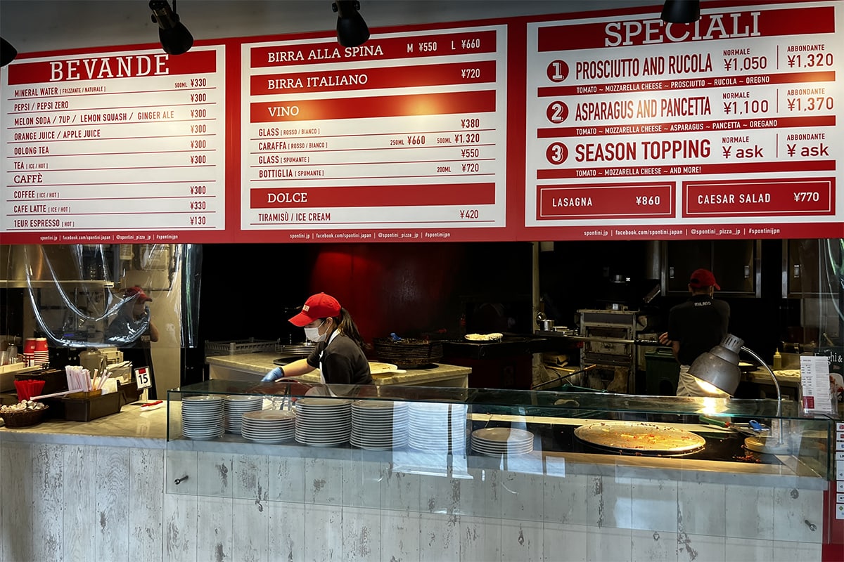 オープンキッチンではピザを焼いている姿を見ることができる。大きなピザ窯が目を引くが、耳をすませてみるとパチパチと音が聴こえる。揚げ焼きのように生地に熱を加えることであの独特のカリカリ食感を生み出しているというわけ。耳までおいしいどころかピザ耳周りがいちばんおいしいと思えるピザはスポンティーニならでは。