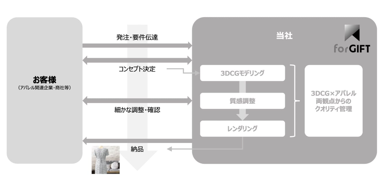 大まかな流れとして、まず3DCGを依頼するアパレル関連企業や商社は、同社とのヒアリングを元に要件、コンセプトを決定する。その後、3DCGモデリング、質感の調整、レンダリングを経て3DCGが納品される。これらの中で、顧客とのヒアリングやコミュニケーションは頻繁に行われ、細かな調整が加えられた上で、要望にあった3DCGが届けられる仕様となっている。