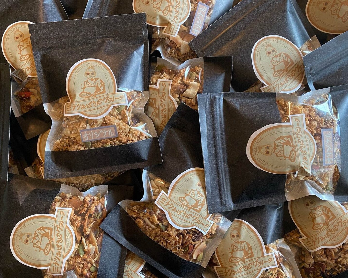 昨年の5月1日にデビューしました。名前の由来はすごく単純で、「Minatsuが作ってるグラノーラ」で“ミナグラ”(笑)。作り始めたきかっけも、コロナの自粛期間に寂し過ぎて何か作ろうかなって。グラノーラだったら小分けにして袋に詰めたら知人に送れるし、ふざけたパッケージも付けて贈ったらクスっと笑って喜んでくれるだろうなと、本気の遊びをするつもりで作ってみました。それで配ってみたら友人たちがSNSで紹介してくれて、商品化に繋がっていったんです。