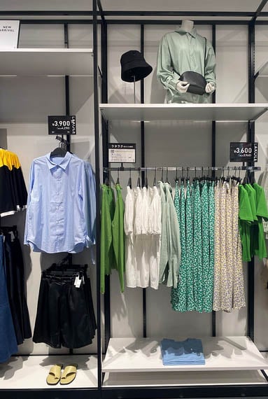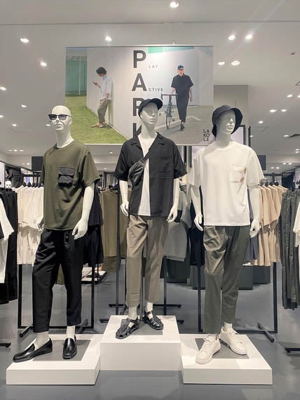 売り場の広さを生かし、VMDにも力を入れる。レディスとメンズはそれぞれ、月に1回の頻度で打ち出したいテーマを設定し、それをイメージしたスタイリングをトルソー3体とビジュアルで見せる。同様に、生活雑貨も月に1度テーマを設け、イチ押し商品を集積する。例えば、5月は「レジャー」とし、手持ち扇風機や水筒などを並べた。
