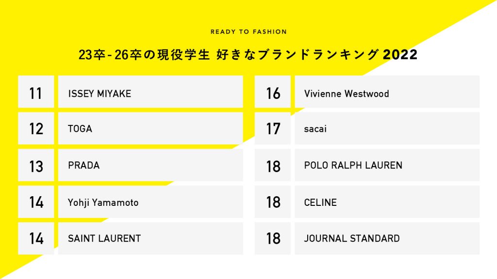 TOP10入りを逃したものの、「ISSEY MIYAKE(イッセイ ミヤケ)」「TOGA(トーガ)」「Yohji Yamamoto(ヨウジヤマモト)」「sacai(サカイ)」などの国内発デザイナーズブランドが目立つ結果となりました。