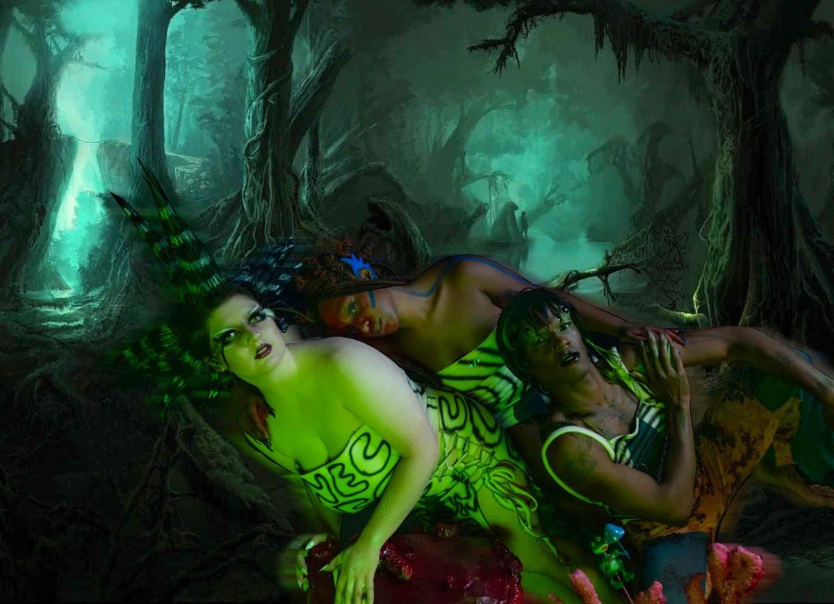 3つめはさらに奇妙だ。3人のゴブリンが、蛍光色に光る深海の底に横たわる。前景には巨大な硫黄の泡が浮かび、そのテカテカと光る表面は、ネオンの珊瑚や大きなキノコ、雄大な草木の風景を反射している。