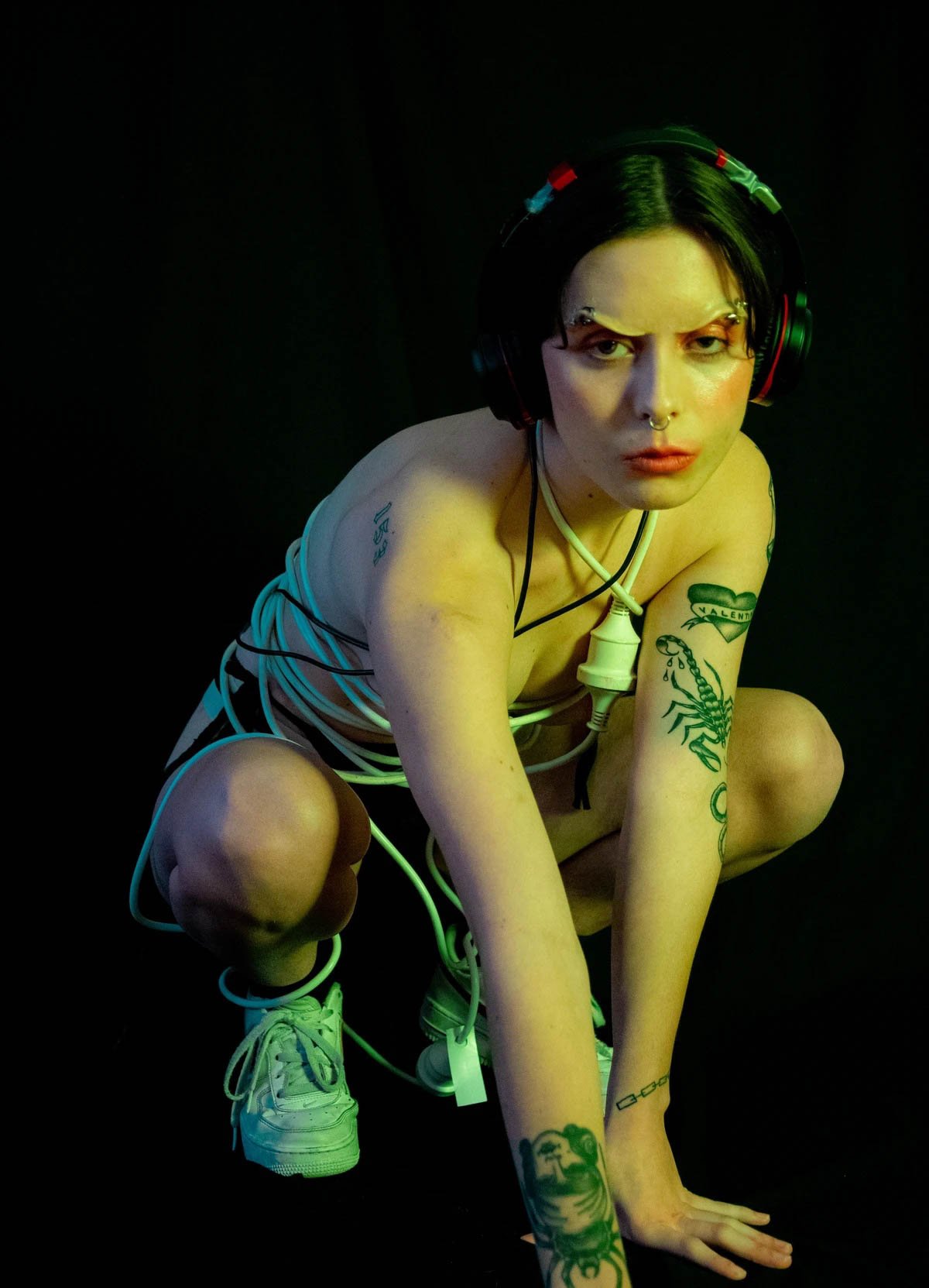 最初に現れるのは、緑色の光に照らされてしゃがみこむ、悪魔のような妖精。冷たさをたたえた金属のピアスが、光を反射しながら怪物のように突き出た眉骨を飾る。全身には、よくある白の延長コードが絡みついている。