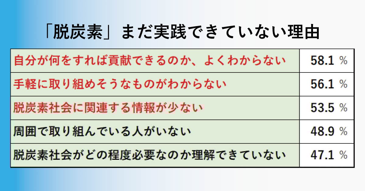 残念ながら我々のような30-40代の男性がもっとも関心が低いという結果も分かりました。また、大企業や政府だけでなく自分たちも取り組むべきだと感じている人は70%近くいた一方、実際にアクションを起こしているという人は全体の3.3%と僅か。アクションを起こせない理由として、「なにをすればいいかわからない」と感じている人が多くいることが分かりました。