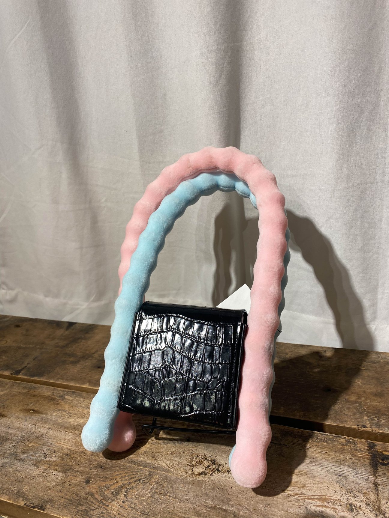 サヤエンドウモチーフの持ち手が特徴の「DOU DOU」バッグシリーズは、本体にはクロコダイル柄のエンボス加工を施した牛革を採用。持ち手部分は、高圧プラスチックボールに短毛リントを被せて製作した。カラーは、マカロンを彷彿とさせる薄い水色やピンク、ライムグリーンなどを展開。一見ソフトな質感に見える持ち手の中に、硬い高圧プラスチックボールを入れることで、視覚と触覚のコントラストを生み出したという。