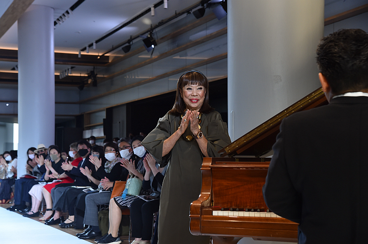 「コロナ禍で言葉も行動も制限されて、やせ細っていくようでした。その中で、お酒が発酵していくようにふつふつと、ちゃんとしたものを作っていかなければならない使命を感じました。フォルムの素敵さ、アーティスティックを感じてほしい。それは素材と技術の裏付けがないとできない。それを残していきたい。オートクチュールはプレタにインスピレーションを与えるもの。(ピアニスト、横山幸雄さんの生演奏による)完成されたクラシック音楽と能面のメイクも、環境として見ていただきたい。新たな挑戦です」