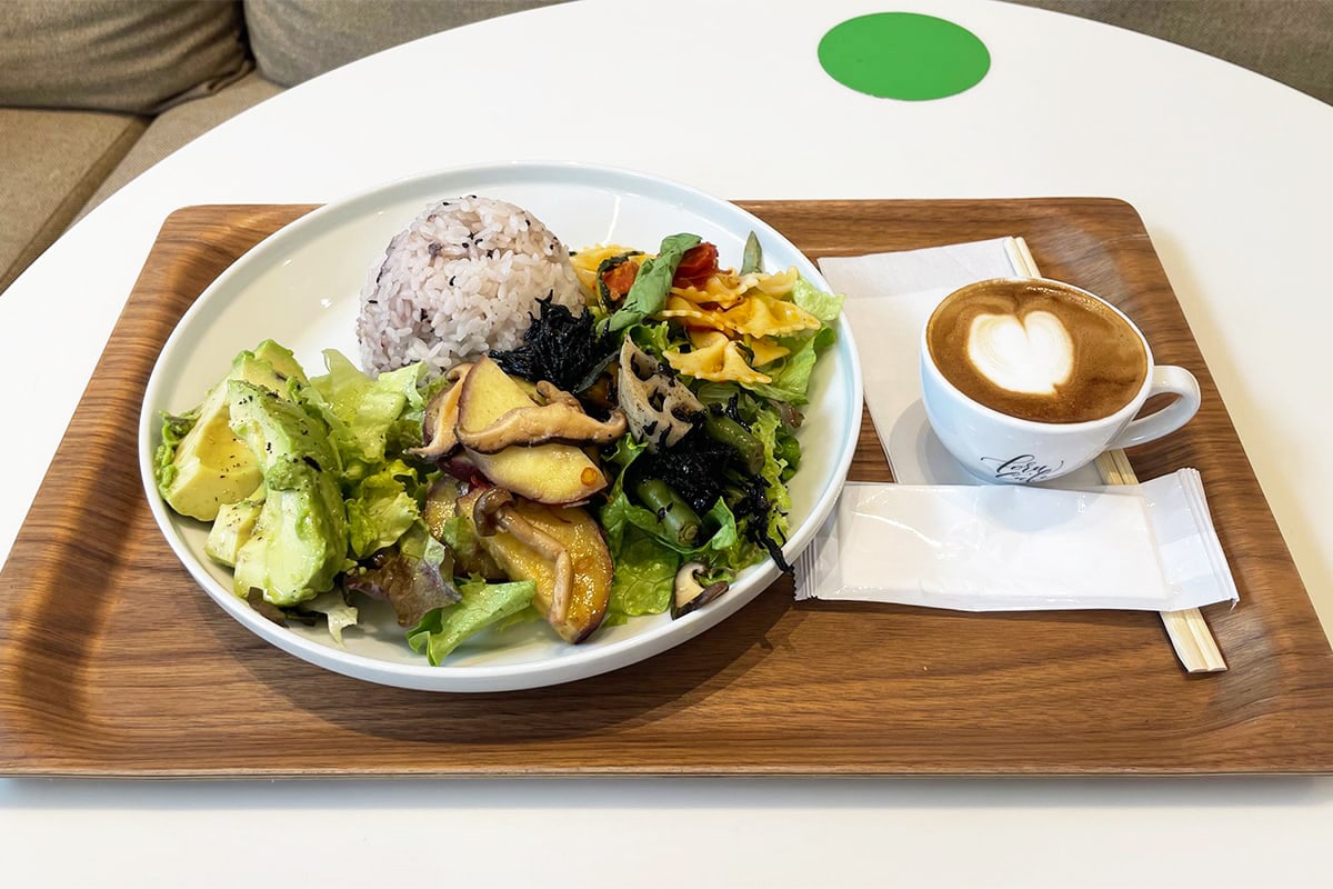 プレートのボリュームは想像以上。リンゴ酢と玉ねぎのさっぱりなドレッシングとよく絡んで、どんどん食べすすめてしまう。フレッシュアボカドには黒胡椒がかかっていていいアクセントに。大好物なので自分で買うこともあるが、ハズレを引くことも少なくない。固すぎず柔らかすぎないクリーミーでベストな食感。なかなかここまで丁度いいアボカドと出会う機会は少ない。トマトとルッコラのパスタは、トマトの酸味がさっぱりと食べやすく、リボンの形をしたパスタのもちもち感ともよく絡んで食べ応えも十分だ。