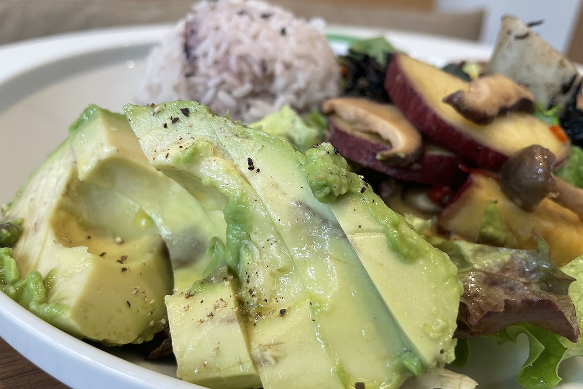 五穀米+サラダベース (フレッシュアボカド、ひじきとインゲン、カボチャの和風サラダ、トマトとルッコラのサラダ、さつま芋とキノコのバルサミコソテー)1,080円
