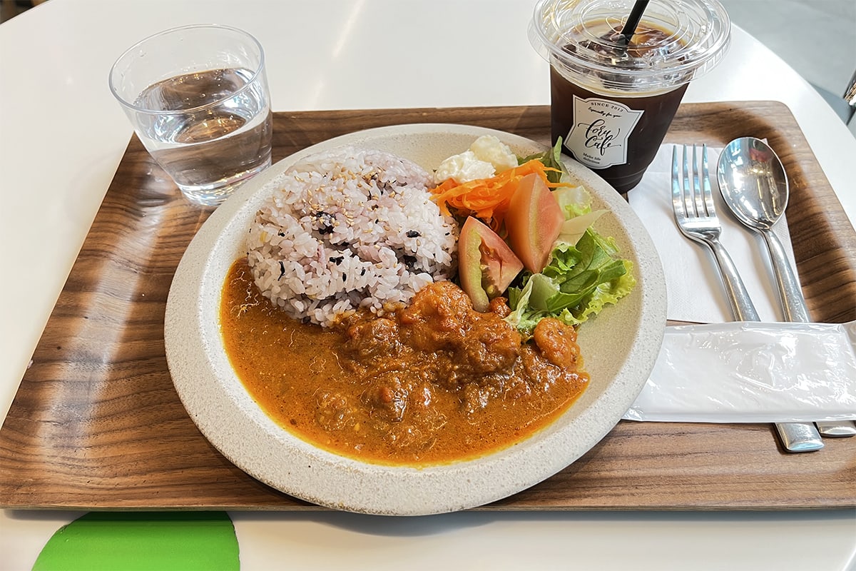 食べたもの:選べる4種類のデリと五穀米のプレート(1,080円)、エビのカレー(980円)