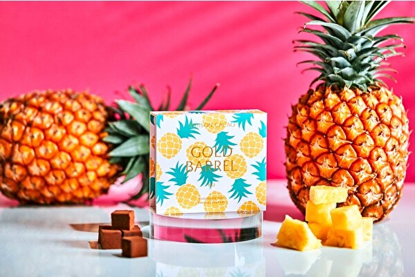 パイン柄のパッケージがかわいい『アロマ生チョコレート ゴールドバレル』(税込2592円)は、ゴールドバレル×柔らかなカカオテイストを持つミルクチョコのマリアージュ。