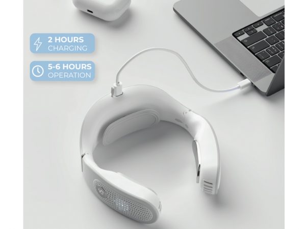QOOLAは内蔵バッテリーで駆動しますが、フル充電時の作動時間は冷房の場合が5時間、暖房だと6時間となっています。QOOLAそのものはUSB-Cケーブルで充電するようになっていて、所要時間は約2時間です。