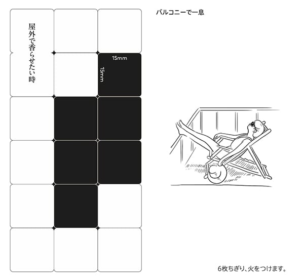 使いたいときは、ミシン目に沿ってちぎって点火。灰皿などにのせた不燃マットの上に置いて、香りを楽しみましょう。