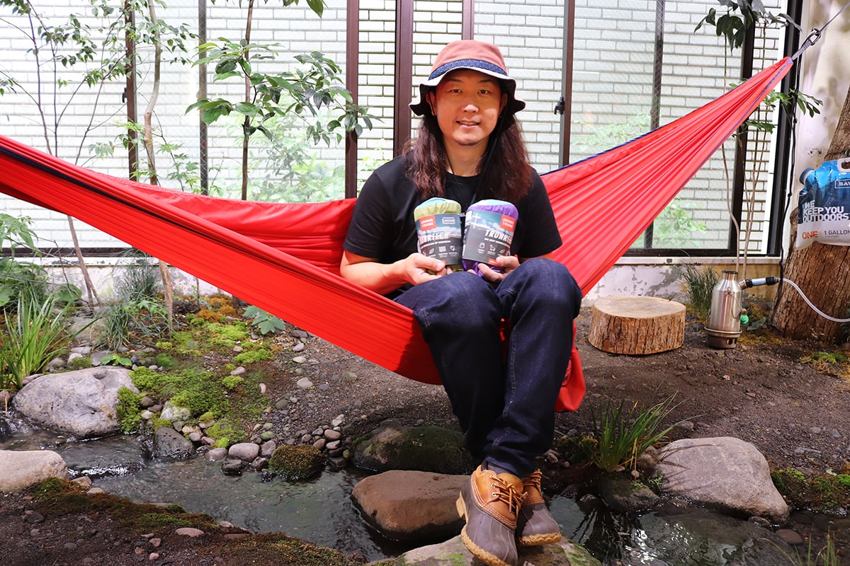 「プライベートでも愛用しているハンモックがこちら。簡単に貼れて、軽量で頑丈、そして寝心地も最高です。最近は妻やキャンプ仲間と、マイハンモックを持ってのハンモック泊が多く、メーカー独自に開発されたTrunkTechリップストップナイロンの生地は、ソフトで高い強度を持ち、通気性・速乾性もあります。カラバリもたくさんあるので、この夏はマイハンモックをぜひ。スペースがあれば家の中でもソファ代わりにできる優れもの。アウトドアライフにスパイスを与えてくれるアイテムです。」