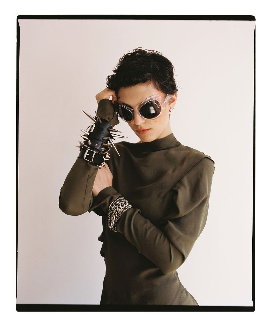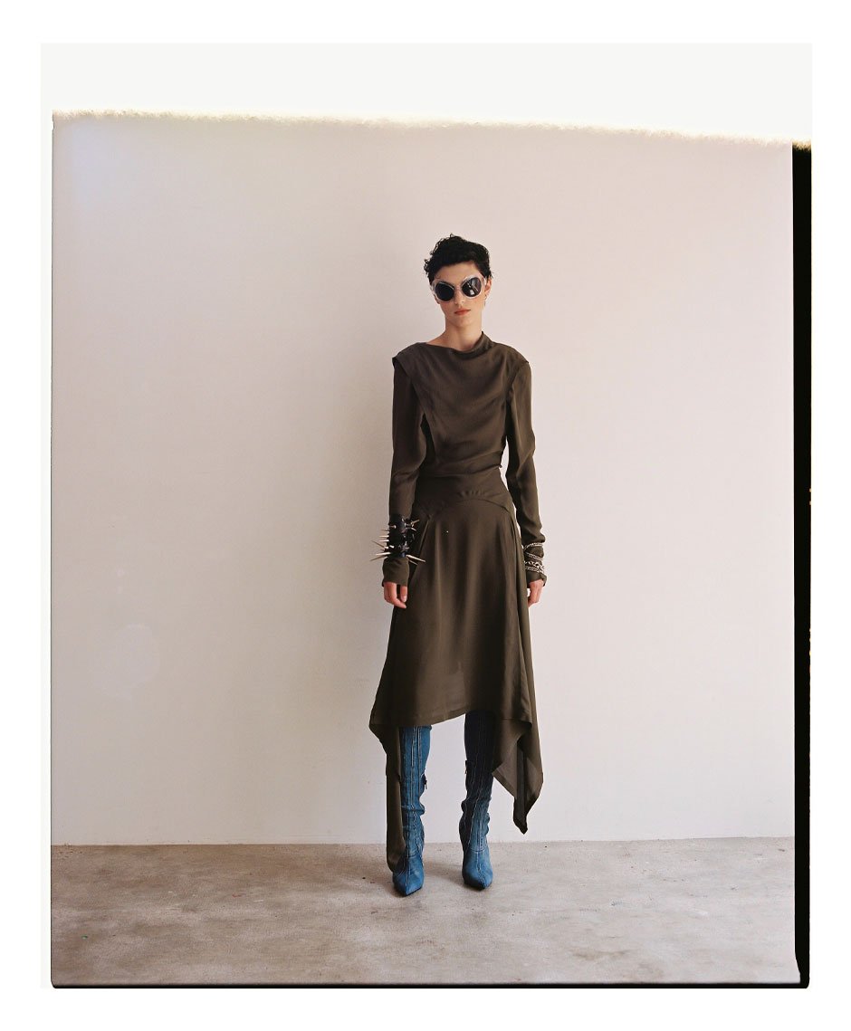 dress by JW ANDERSON, boots by DIESEL, sunglasses by SPORTMAX, earcuff by AMBUSH, all bracelets stylist’s own