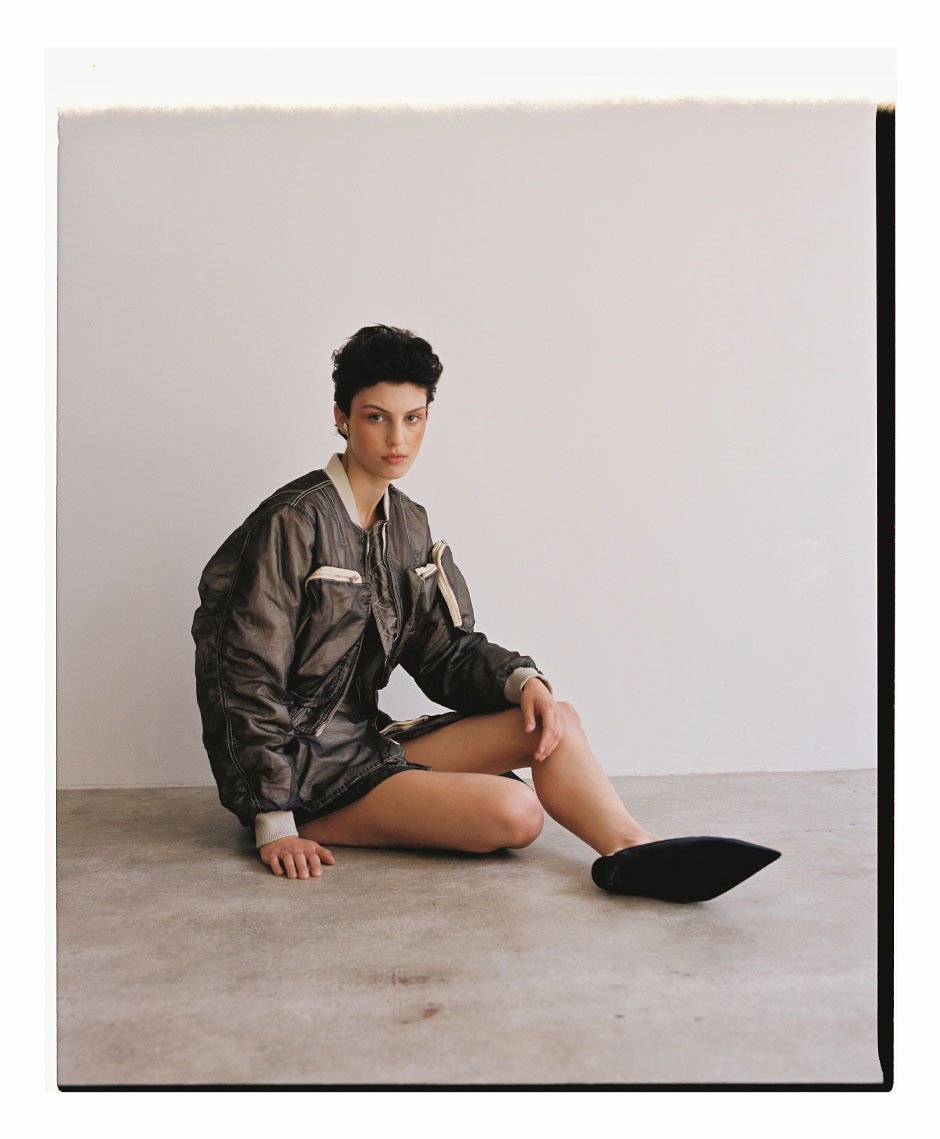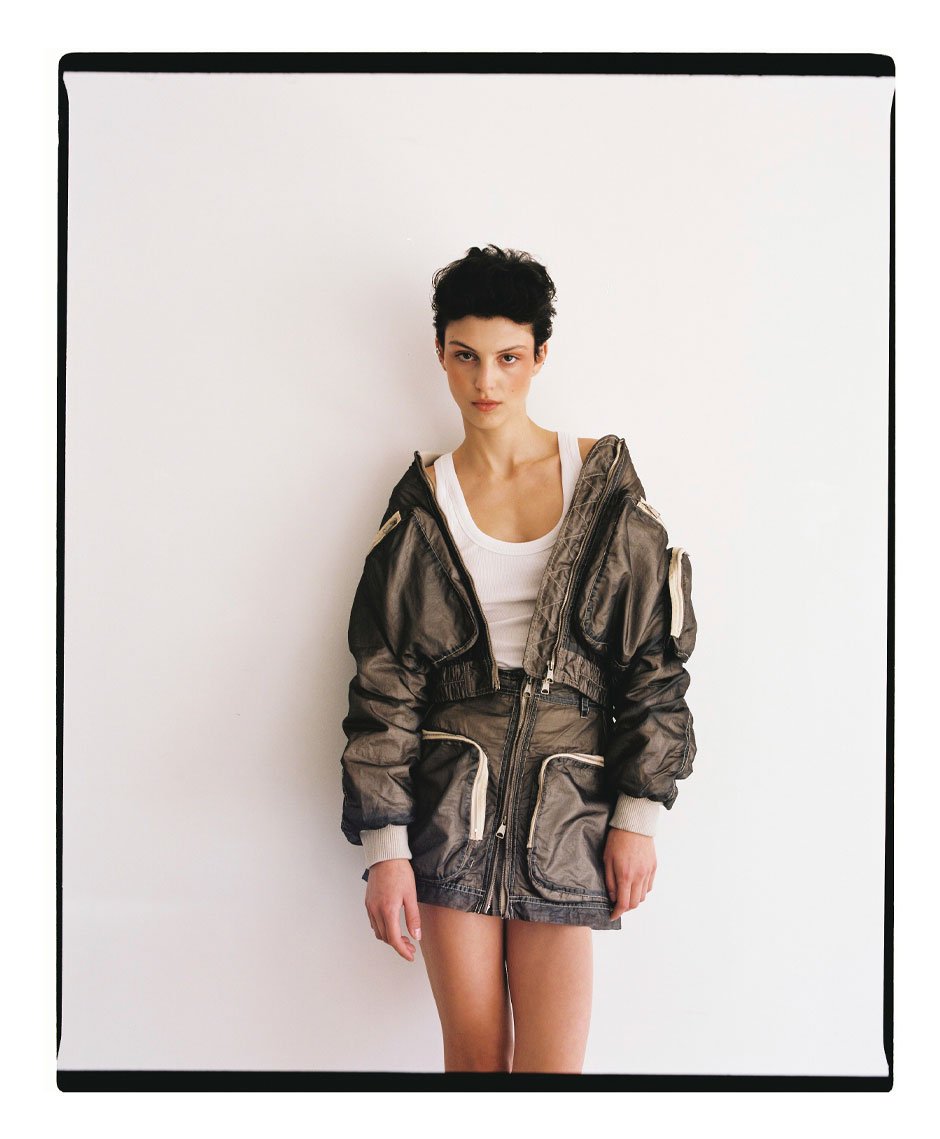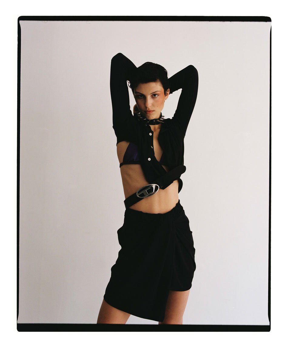 jacket, top and skirt by DIESEL, shoes by BIMBA Y LOLA, earcuffs by AMBUSH