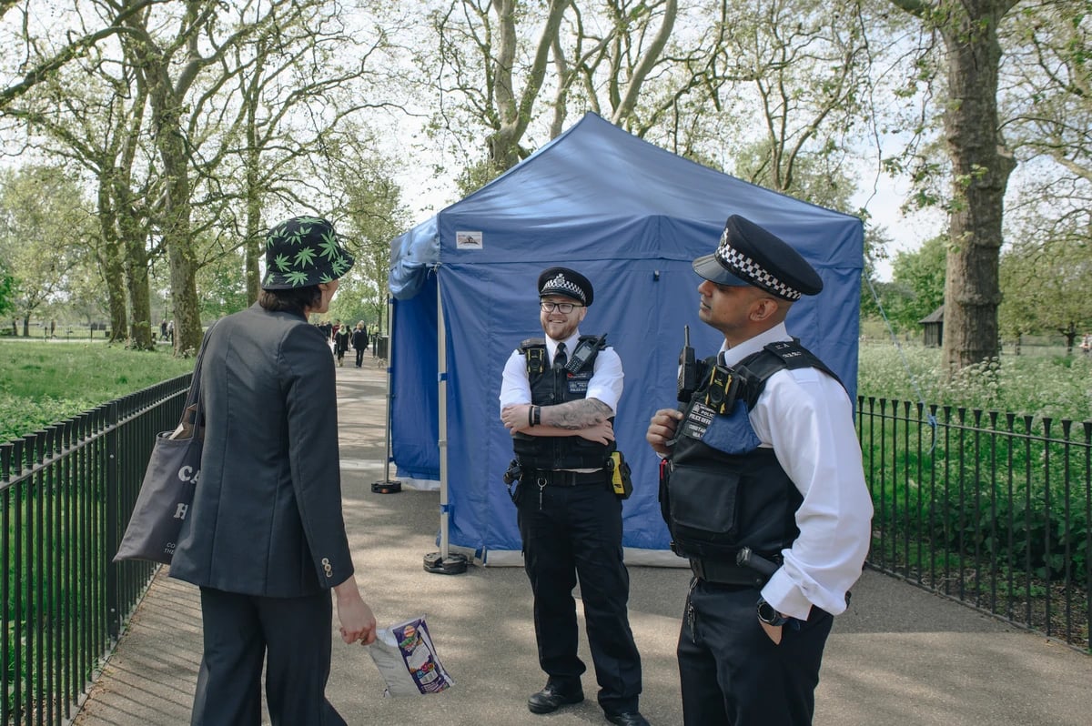 「みんな捕まらないといいけど」とリヴァプールから来たチーチ(Cheech)は語った。僕が取材した人全員と同様、大麻は英国でいまだにクラスB薬物として分類されているため、彼は匿名でインタビューに応じた。「ここに来るまでに4時間かかった。逮捕されるのはうんざりだ。今までも何度もあったけど、バカバカしい。あいつら警官を見てみろ。コソコソしやがって。みんなからウィードを取り上げるんだ。なぜ俺たちのことを放っておけない?」