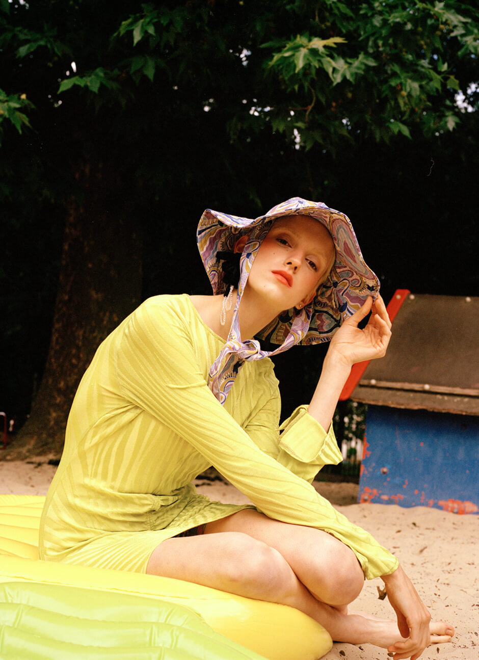 swimwear by NINKY LONDON, shorts by FAM IRVOLL, sandals by VANDRÉLAAR, earrings, necklace and bracelet by 15DEGREESLONDON, hat stylist’s own