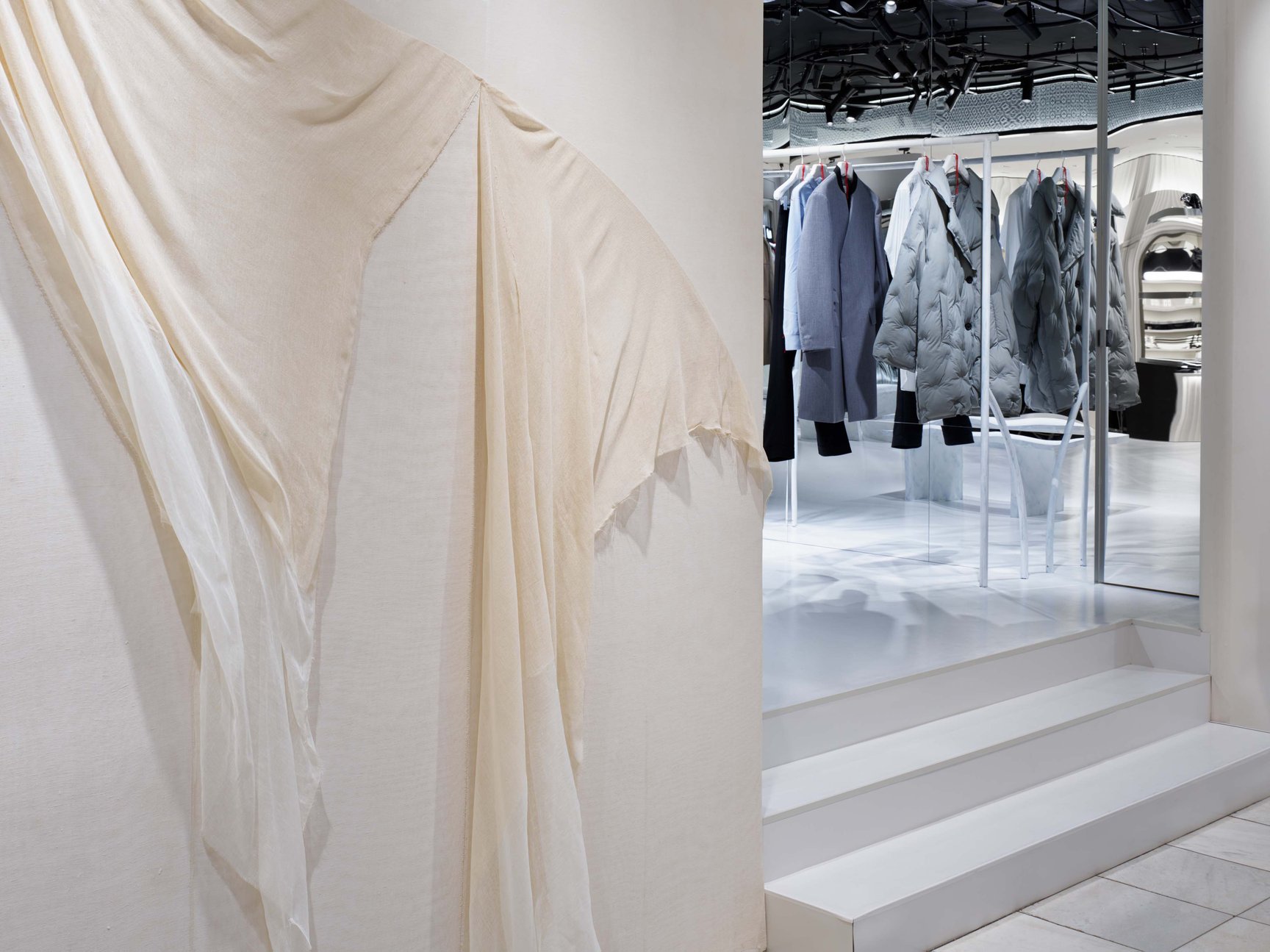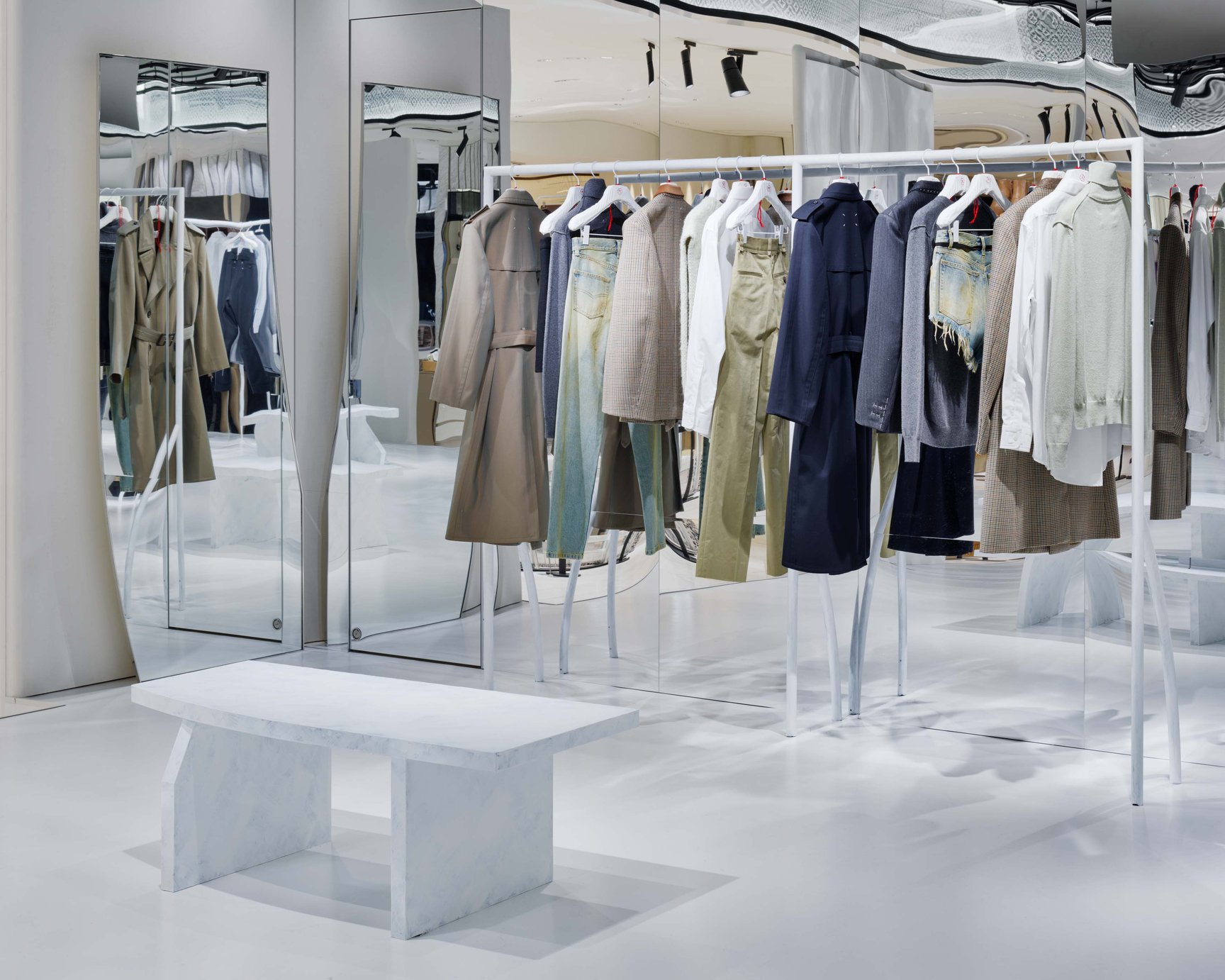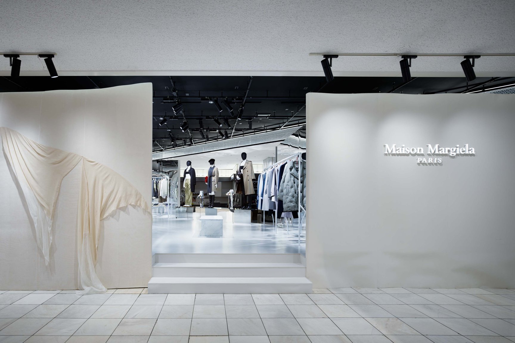 今回のポップアップストアでは、白い仕付け糸のステッチをデザインとして取り入れた「ワーク イン プログレス」トップステッチやカフ部分に「メモリー・オブ」のステッチを施したテーラードジャケットとコートをはじめ、フロントにギャザーをあしらったスカート、キルティングディテールが特徴の「グラム スラム」コート、着用する過程でペイントが剥がれるデザインを楽しむことができる「ビアンケット」加工を用いたデニムアイテム、アイコンシューズの「タビ(Tabi)」などをラインナップする。