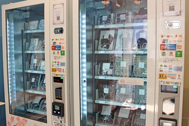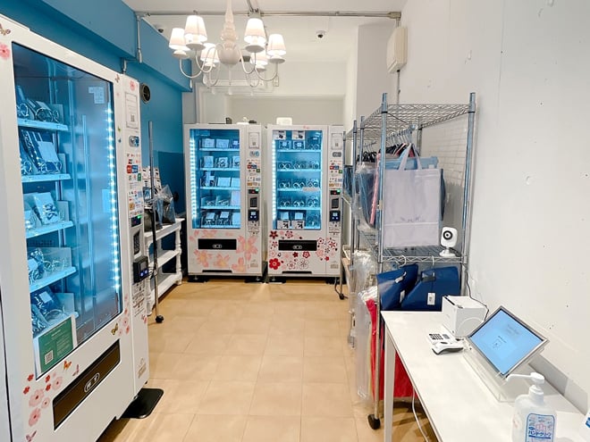 場所は恵比寿駅東口から徒歩7分。広尾や白金高輪へと抜ける恵比寿通りに面したビルの1Fにある。店内には自販機が3台設置されており、中には光沢のあるネイビー素材で小さなおリボンが可愛らしいスリッパやシンプルなハンカチなどの小物などが販売されている。
