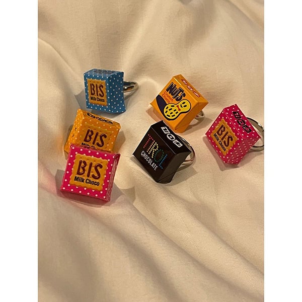 チロルチョコのパッケージデザインをそのまま使用しているというこちらのリングは、食べられるんじゃ…と思ってしまうほどリアルな仕上がり。