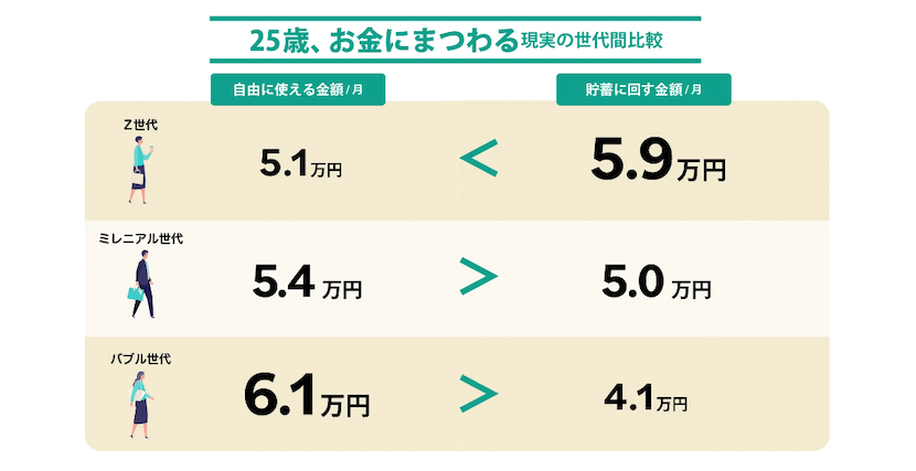 世代が若くなるにつれて、自由に使えるお金は減るものの、貯蓄額は増加。Z世代は、3世代で唯一、自由に使えるお金を貯蓄額が上回る結果となった。