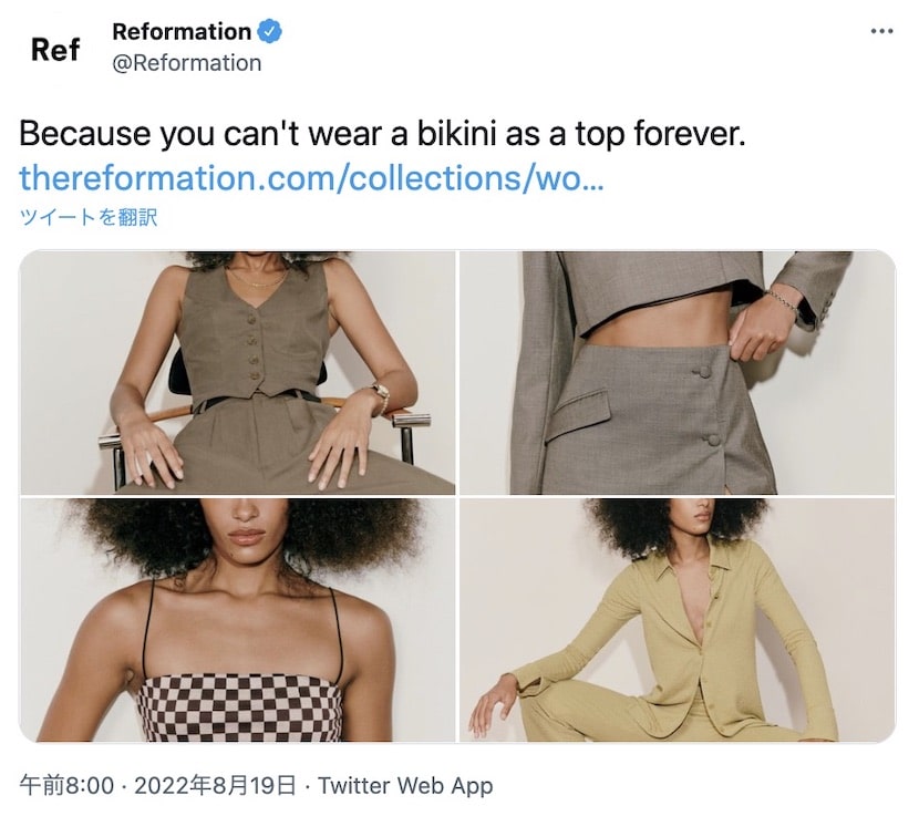 「ずっとビキニを着ているわけにはいかないからね」というキャプションの投稿。(Reformationの公式Twitterより)