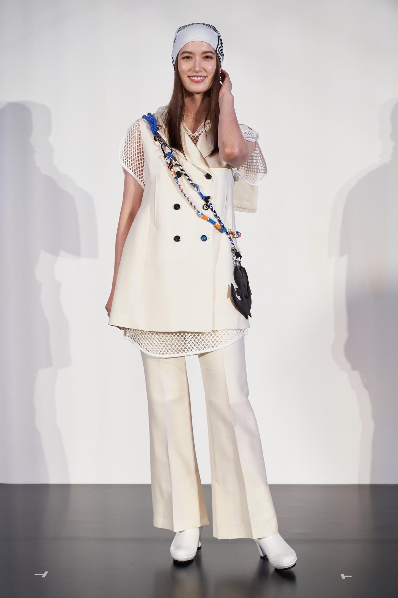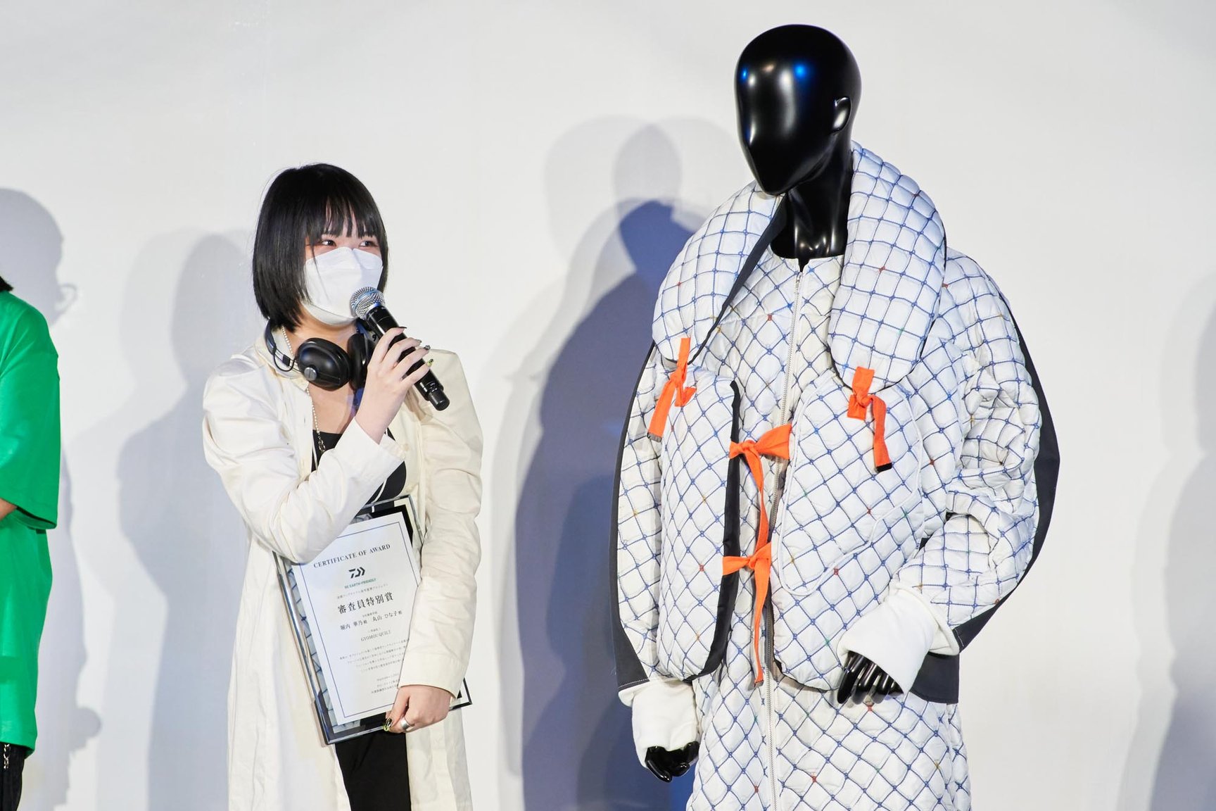 優秀賞はデニム素材と組み合わせることで海底のアトランティスをイメージした竹内大樹の「ATLANTIS」と、透明な素材で海上の月光をイメージした鐘慧と李青雲、朱玲之の共同制作による「海の世界から生まれ変わるアップサイクル」で、2作品は同イベント終了後もダイワアパレルショールームで展示される。また、優秀賞に劣らず高い評価を得た作品として、イ・チャンミンの「Seam Sealed Gear シームシーリングギア」と、堀内華乃と丸山ひな子の共同制作による「GYOMOU QUILT」が審査員特別賞を受賞した。ディーベックの海をイメージしたセットアップを着用したトラウデン直美は「学生さんが作ったとは思えないくらい高いクオリティで驚きました。ファッションはメッセージ性が大事だと思いますが、学生さんの想いが洋服を見て伝わってきました。学生の皆さんには世界へ羽ばたいて、サステナブルをどんどん伝えていってほしいなと思います」と振り返った。